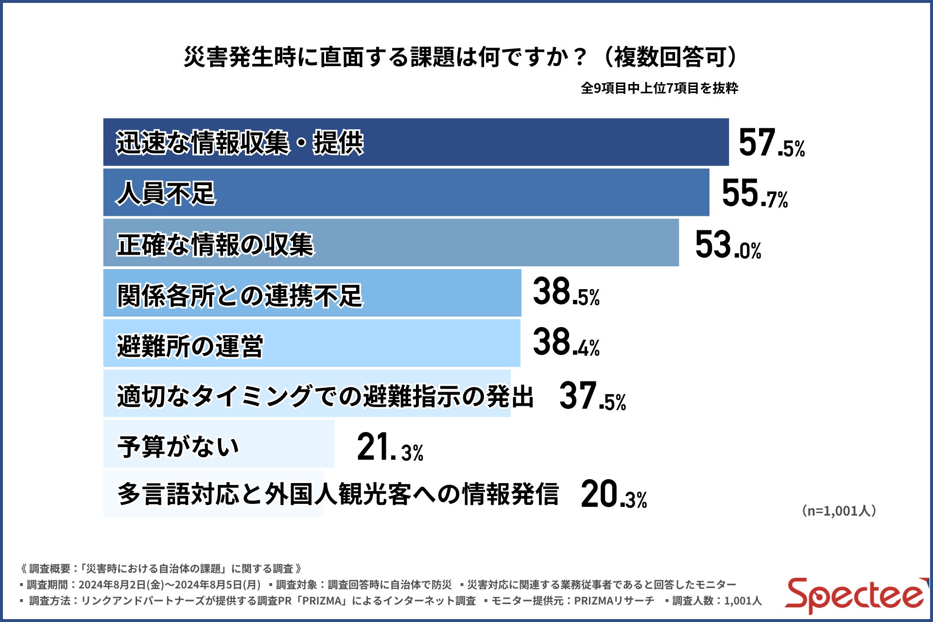 Spectee は全国の自治体や多くの民間企業にAIリアルタイム防災・危機管理サービス『Spectee Pro』を提供しており、自治体で防災・災害関連業務に従事する方々を対象に「災害時における自治体の課題」に関する調査を行いました。