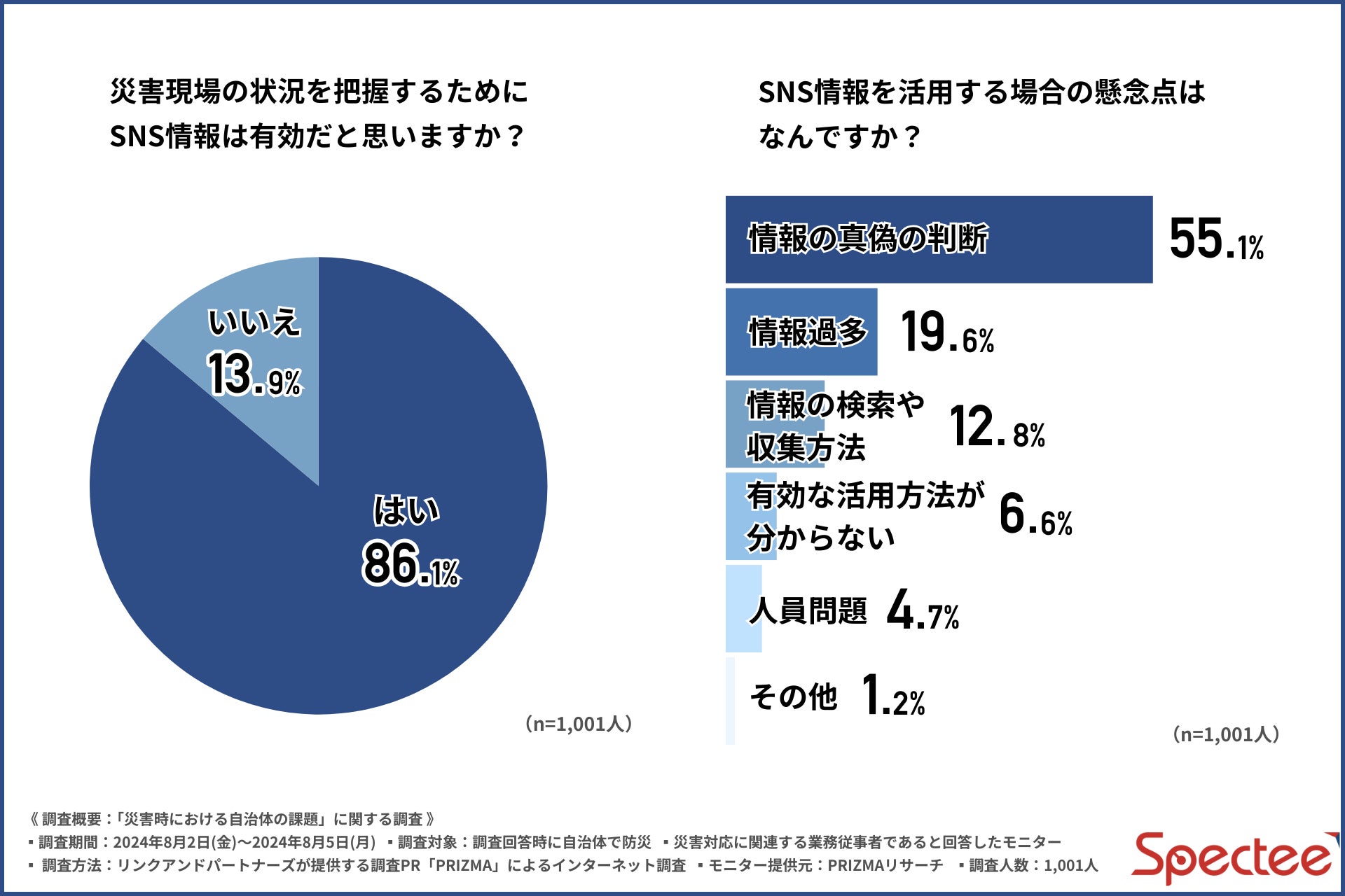 「災害現場の状況を把握するために、SNS情報は有効だと思いますか?」と質問したところ、今回も8割以上の方が『はい(86.1%)』と回答しました。