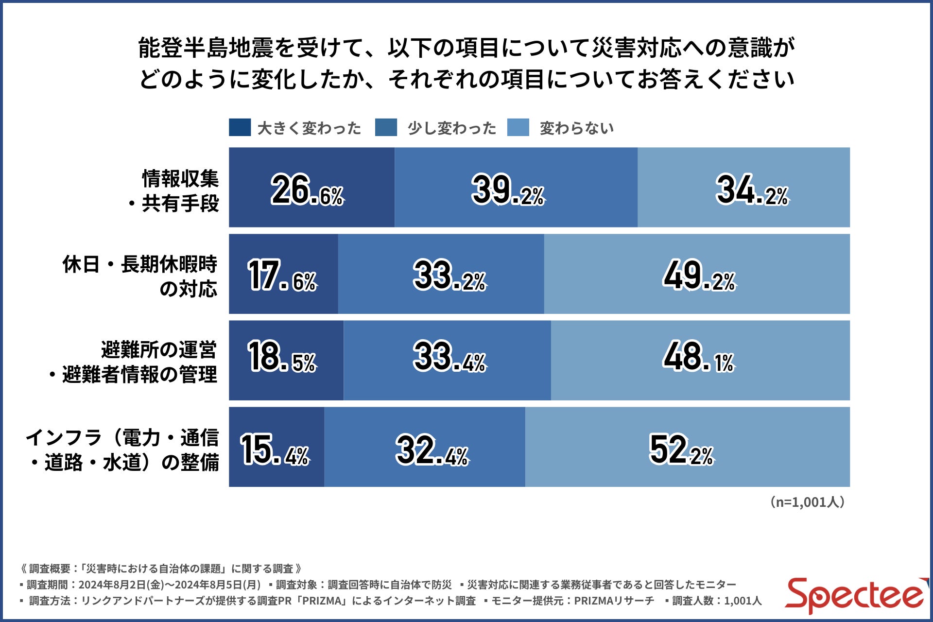 能登半島地震後、全ての項目において一定の意識変化が見られましたが、特に「情報収集・共有手段」について7割弱(約66%)も意識が変わったと回答しています。また、避難所の運営・避難者情報の管理についても約半数(51.9%)は意識が変わったと回答しました。