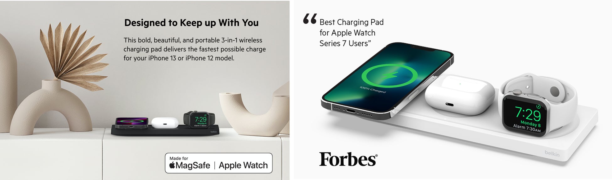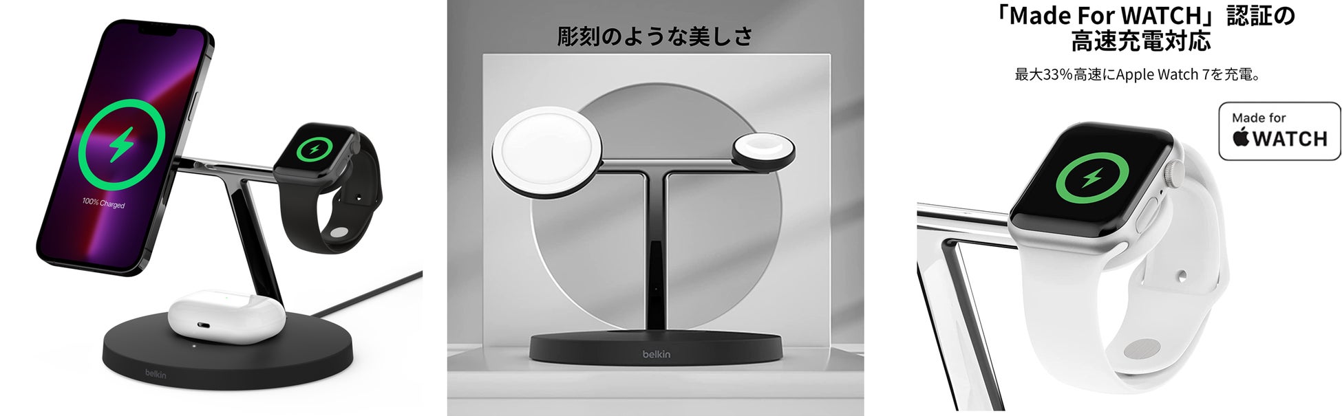 世界で初めてApple Watch 7シリーズの急速充電に対応した「Belkin BOOST↑CHARGE™ PRO MagSafe 3-in-1 ワイヤレス充電パッド」は、同じく15WのiPhone 14/13/12シリーズの急速充電が対応可能で、USのForbes社よりApple Watch 7シリーズユーザーに最適な充電パットと評価されました。この度、スタンド型のBelkin MagSafe 3-in-1 for Apple Watch改良版の発売により、スタンド型とパット型から、ご自身のスタイルにあった製品をお選びいただけるようになります。
