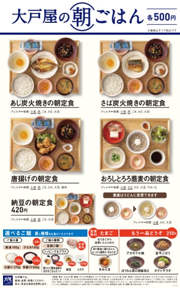 碧南市役所店では、通常メニューの他にも9:00~10:30の時間限定で「朝定食」を販売いたします。朝定食は全5種類。ワンコイン(税込500円)で大戸屋の定食が楽しめます。(※納豆の朝定食はなんと税込420円!!)