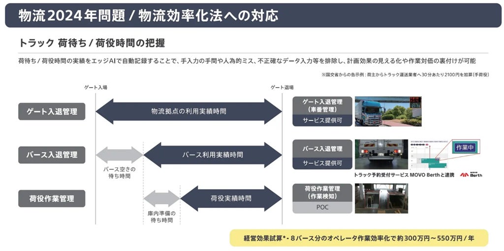 ・運送トラックのナンバープレート(車番)を検知/認識することで待機/荷役時間の自動取得を