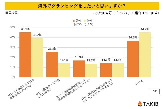 前回、海外でキャンプをしたいですか?というアンケートを実施した際に「はい」と回答した方が、女性が45.8%、男性が59.0%だった為、今回は男女ともに前回結果を上回る結果となりました。キャンプよりもグランピングの方が多くの人にとって挑戦しやすいということが分かります。
