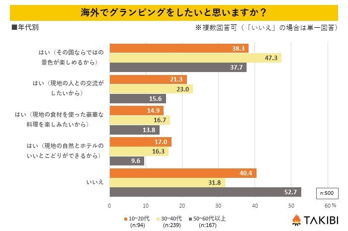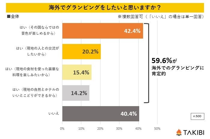 グランピングに行ったことがある・興味がある10代~60代の男女を対象とした「海外でグランピングをしたいと思いますか?」というアンケートを行ったところ、59.6%が前向きな考えであることが分かりました。