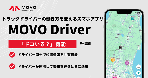 トラックドライバーの働き方を変えるスマホアプリ「MOVO Driver」、ドライバー同士で位置情報を共有できる「ドコいる?」機能を実装