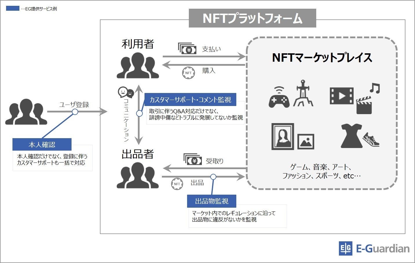 そこで、イー・ガーディアンは今後のNFTマーケットプレイスの普及を見据えて、ユーザーが安心・安全な空間を利用できるように、24時間365日体制でNFTマーケットプレイスの開発から運用まで、健全な運営をサポートする「NFTマーケットバックオフィスサポート」を提供する運びとなりました。