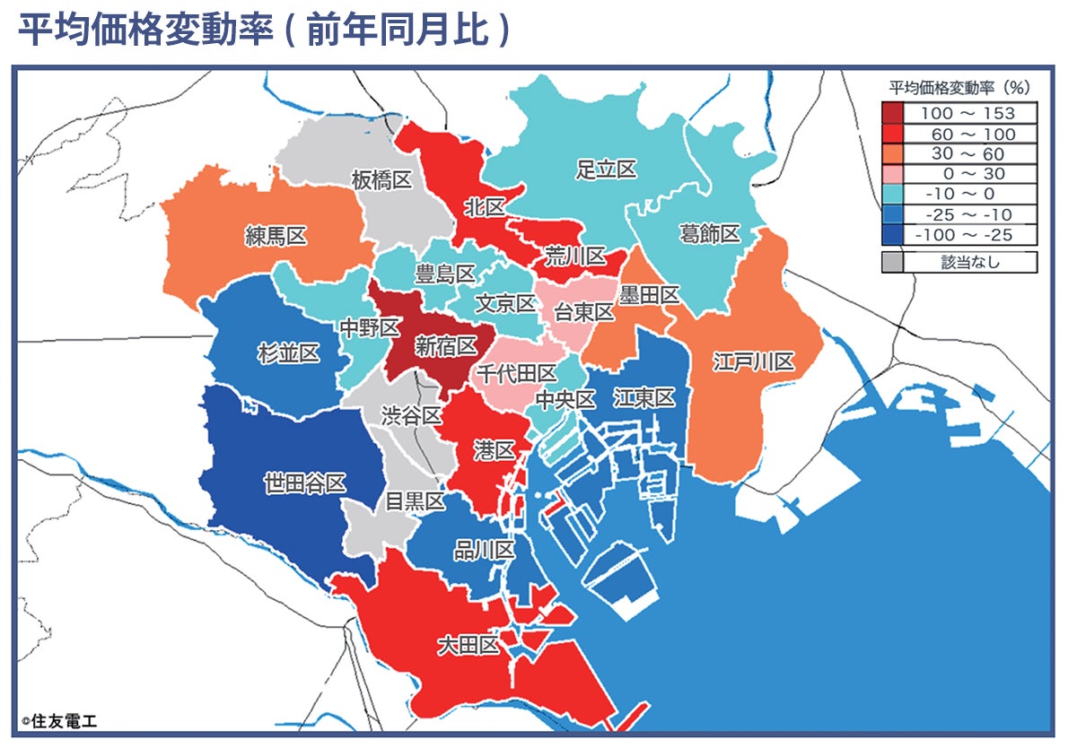 地図の各行政区ごとの色の違いは、同行政区における平均価格の前年同月比(平均価格変動率)の程度を表しています。