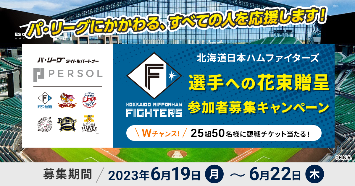 パシフィックリーグマーケティング株式会社(本社:東京都中央区、代表取締役CEO:根岸 友喜)は、2023年度パシフィック・リーグのタイトルパートナーで「はたらいて、笑おう。」をグループビジョンに掲げる総合人材サービスのパーソルホールディングス株式会社(本社:東京都港区、代表取締役社長 CEO:和田 孝雄)とともに、パーソルグループの冠協賛試合「パーソルDAY」試合前セレモニーにおける花束贈呈式参加権のプレゼントキャンペーンの募集を開始することをご案内いたします。