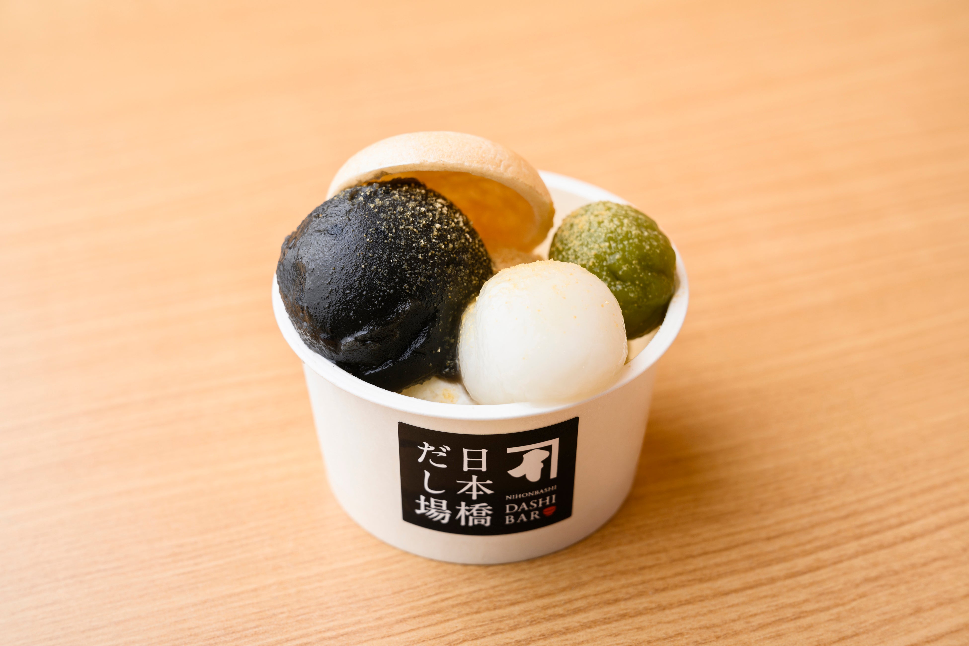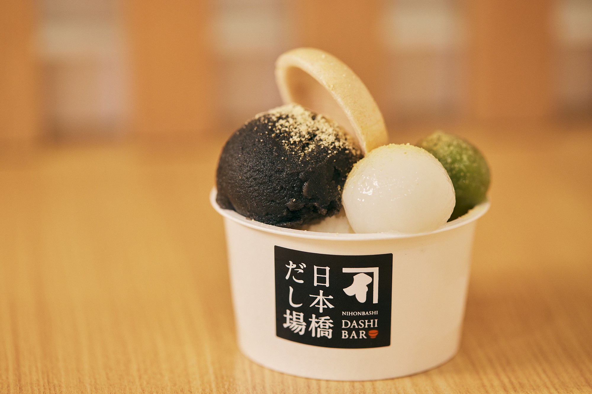 夏がテーマのメニューということで、風味と見た目の両方で楽しめて美味しく“涼”をとっていただける和風アレンジのアイスクリームを考案しました。日本橋だし場らしさを出すため、バニラアイスにつゆの素をかけて和風で 甘じょっぱい味わいに仕立てています。もちもちの白玉とさ控えめな焙煎黒胡麻餡はそんな和テイストのアイスクリームにぴったりです。一口もなかに乗せてパリパリとした食感もお楽しみください。