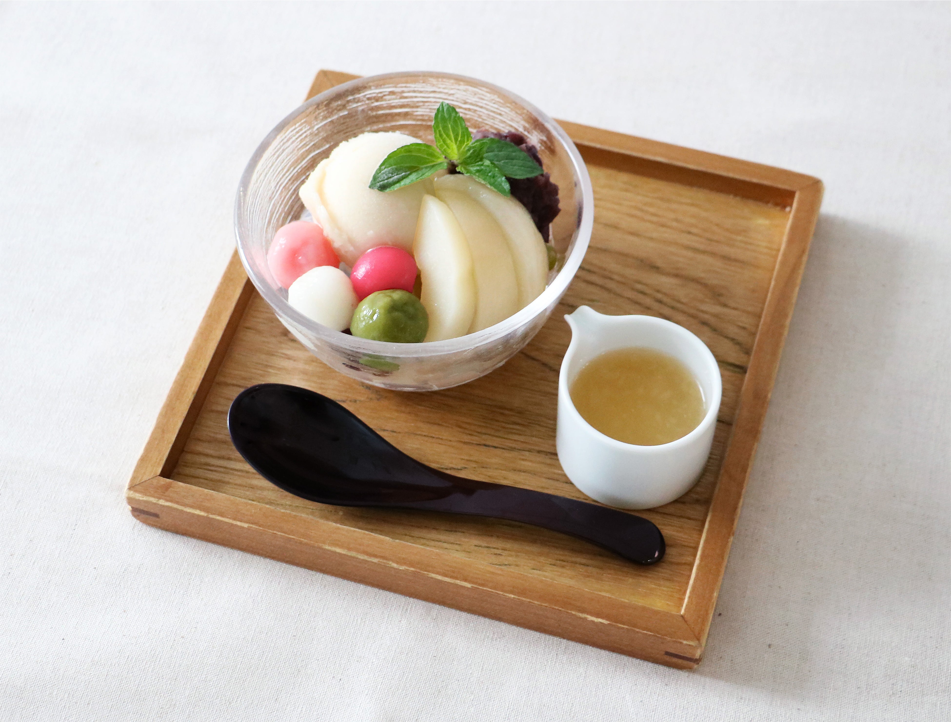夏がテーマのメニューとして、夏が旬の白桃を使用した甘味を考案しました。カットした白桃や白桃シャーベットのほか、3 色の白玉やサクランボも添えて色鮮やかな見た目も楽しんでいただけるよう工夫しました。白桃シロップをかけて白桃づくしの一品をお楽しみください。