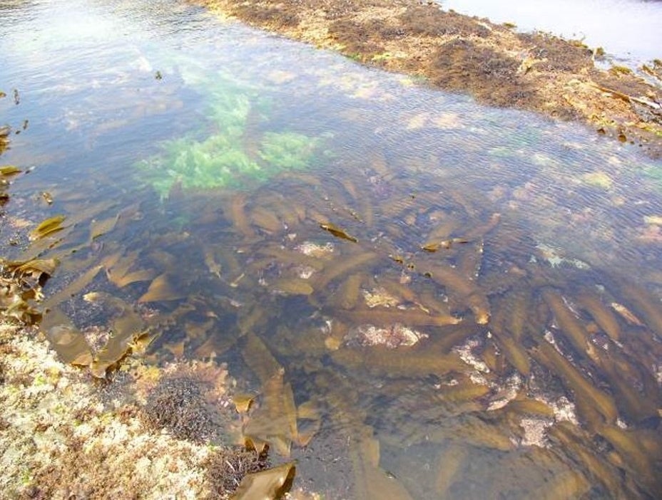 もともとこの岩場は、干潮時には海水が無くなるため海藻が生えない平らな岩場でしたが、約50年前にこの場所に溝を掘って昆布を育て、その昆布でウニを育てる増殖溝に変わりました。
