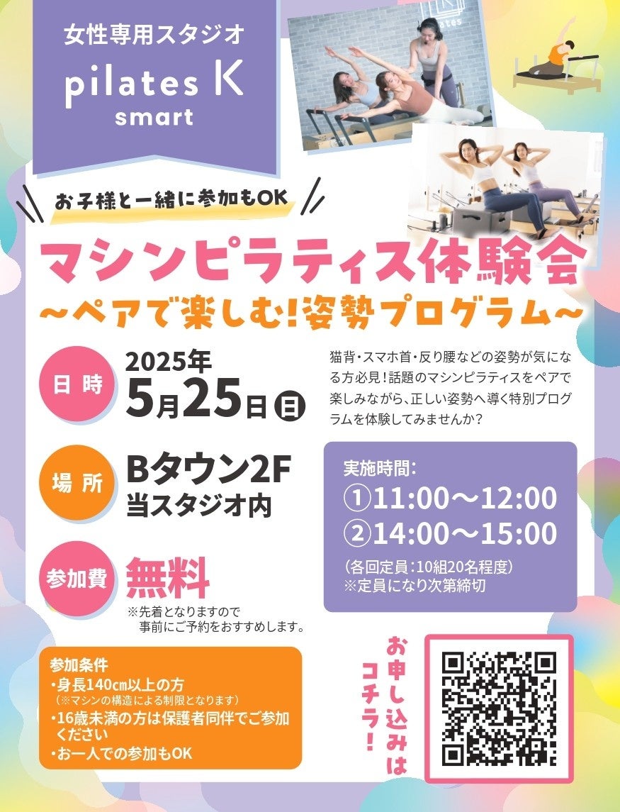 女性専用フィットネススタジオを全国で展開する株式会社LIFE CREATE(本社:北海道札幌市、代表取締役社長:前川 彩香)は、2025年5月25日(日)、ラソラ札幌内にて運営するマシンピラティススタジオ「pilates K_smart(ピラティスケースマート)」にて、参加費無料の体験型イベントを開催いたします。本イベントは、「マシンピラティスに興味はあるけど、きっかけがなかった」「お子様もご自身もスマホ首や猫背が気になる」という方の背中をそっと押すことを目的とした、ペア参加型の少人数制レッスンです。140cm以上であれば年齢問わず参加可能。親子・友人・パートナーとの参加はもちろん、おひとりでのご参加も大歓迎です。また当日は、スタジオ公式Instagram(@pilatesksmart)をフォローしてくださった方へ、特典プレゼントもご用意しています。