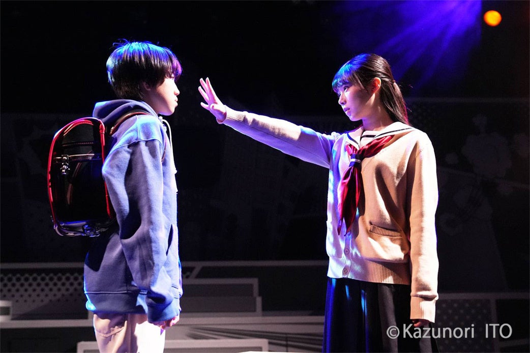 主人公は、IMO*T(劇団Fierce)扮する専業のヒーローこと瀬川マモル。その妻・和子を川上千尋、息子のタスクを鈴木弥人、そして物語のキーとなる娘のモエを龍本弥生が担う。川上が30-DELUX OSAKAに参加するのは、『シェイクス2023』-KANSAI side-以来だが、2年の空白を感じさせないどころか両劇団員たちとの距離がさらに近づいたように見え、IMO*Tとの“夫婦喧嘩”も息の合った掛け合いで惹きつける。寡黙で二面性のある役どころに挑む龍本は、危うく儚げな存在感を全身から醸し出し、モエという人物を全うする。客演の鈴木弥人が演じる小学生のタスクも純朴で瑞々しい。