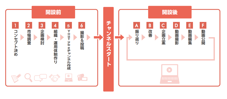 本サービスでは、開設前のチャンネルコンセプトを決めるところから、市場調査・企画検討・体制づくりなどを行い、チャンネル開設後も動画の撮影編集、振り返り分析とコンテンツ・広告の最適化までワンストップでご支援が可能です。