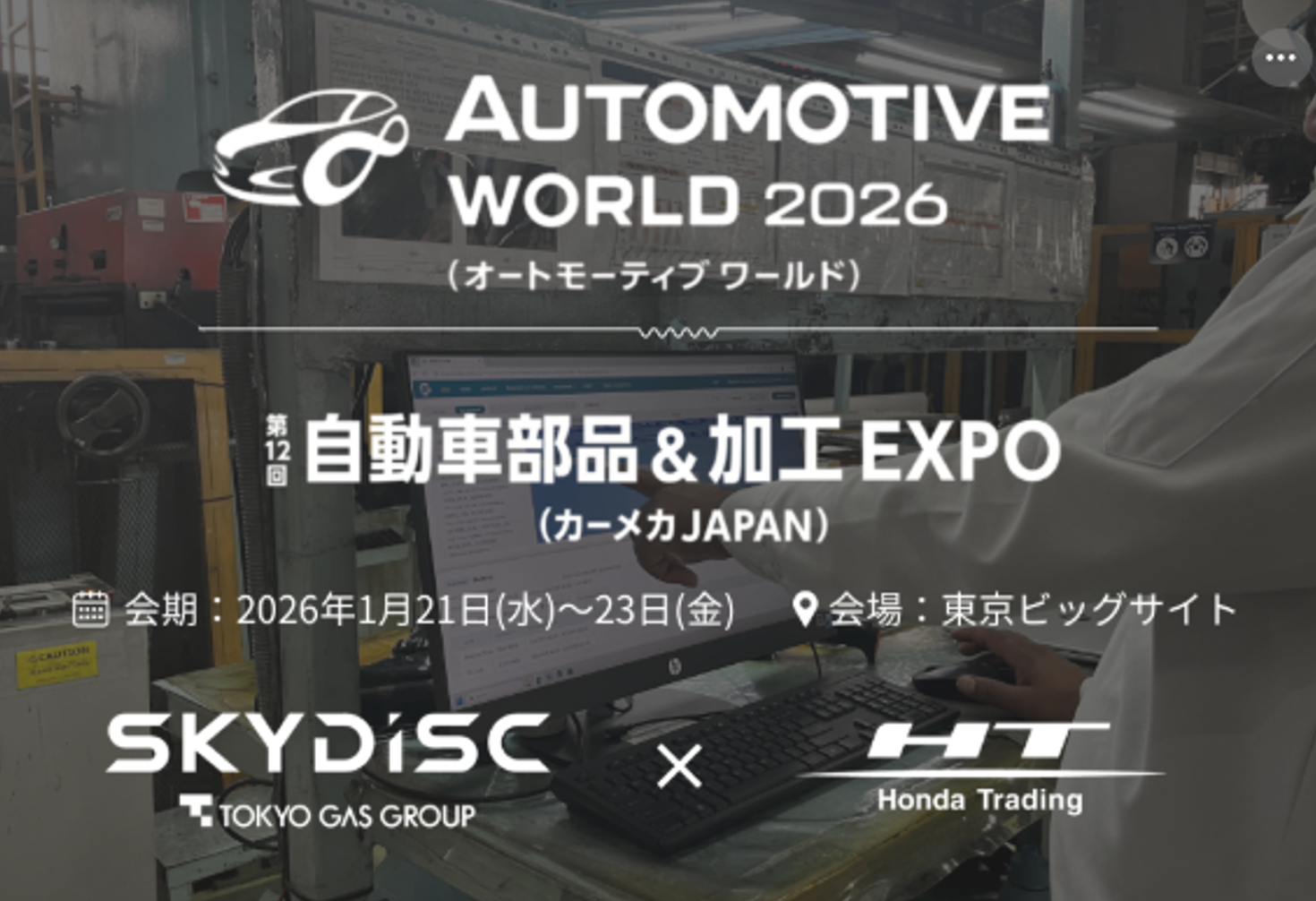 株式会社ホンダトレーディング(本社:東京都千代田区、代表取締役 社長執行役員:夏目 達也)鉄鋼事業部と株式会社スカイディスク(東京ガスクループ/本社:福岡県福岡市中央区、代表取締役CEO:内村 安里)は、2026年1月21日(水)~23日(金)、東京ビッグサイトで開催される世界最大級の自動車技術展「AUTOMOTIVE WORLD 2026」に共同出展します。