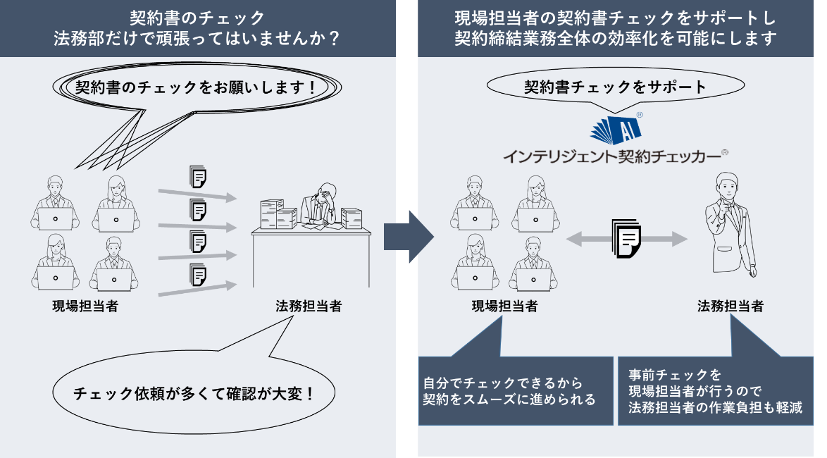 インテリジェント契約チェッカーは、法務部門および現場担当者である営業部門等が行う契約書チェックをAIが支援することで、契約書チェックの作業負担軽減と品質向上を図ることができるシステムです。