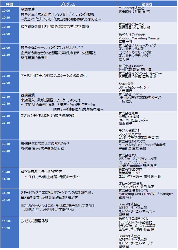 基調講演として、M-Force株式会社の長 祐氏が登壇し、顧客起点マーケティングで売上とブランドを両立させるについてお話しいただきます。その他のセッションでは、オンラインやオフラインでの顧客体験の作り方やデータとAIを組み合わせた施策展開など、最新のテクノロジーと考え方で、顧客エンゲージメント戦略の構築と施策展開までを網羅的に考えます。