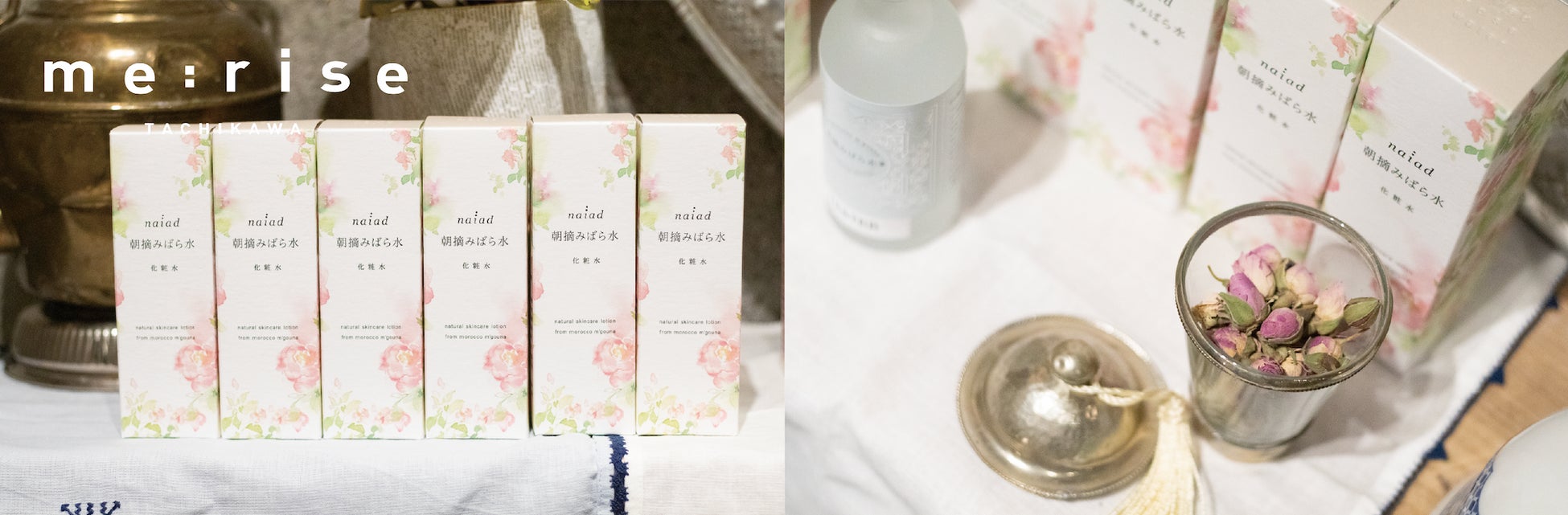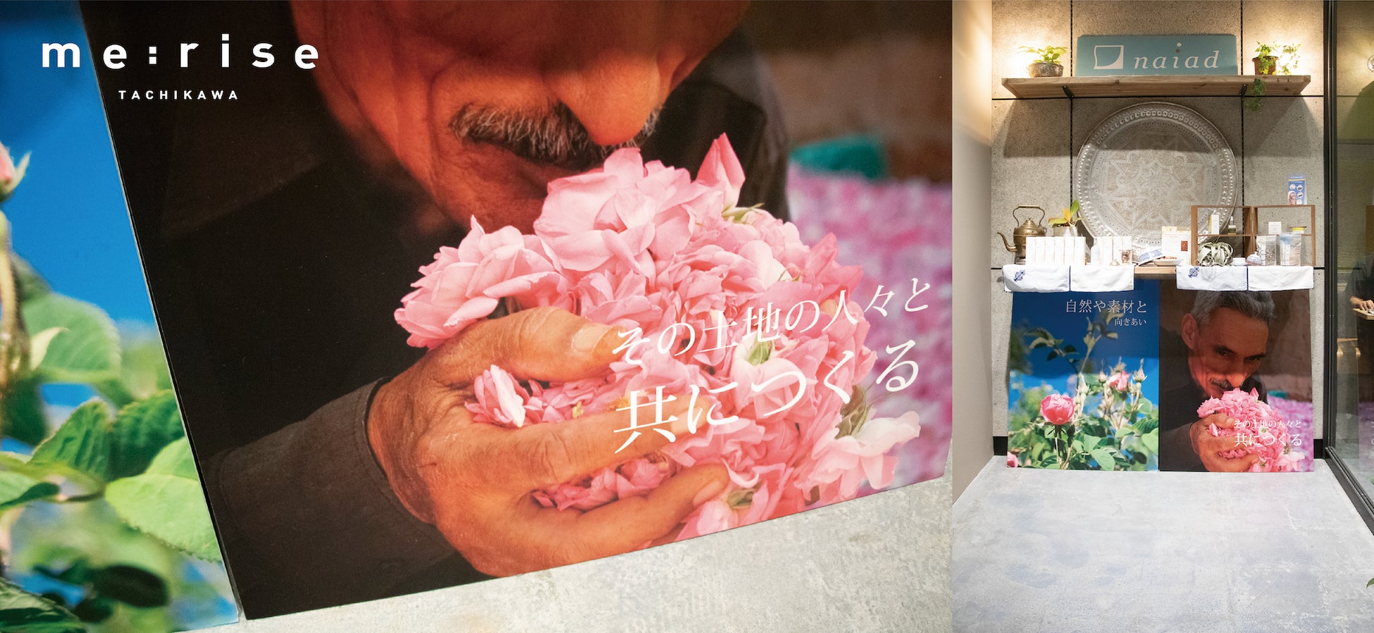 2023年7月24日(月)〜8月7日(月)までの期間で展示を行っているのは、東京都福生市で化粧品製造・販売を行う、株式会社ナイアードさんの「朝摘みばら水」です。