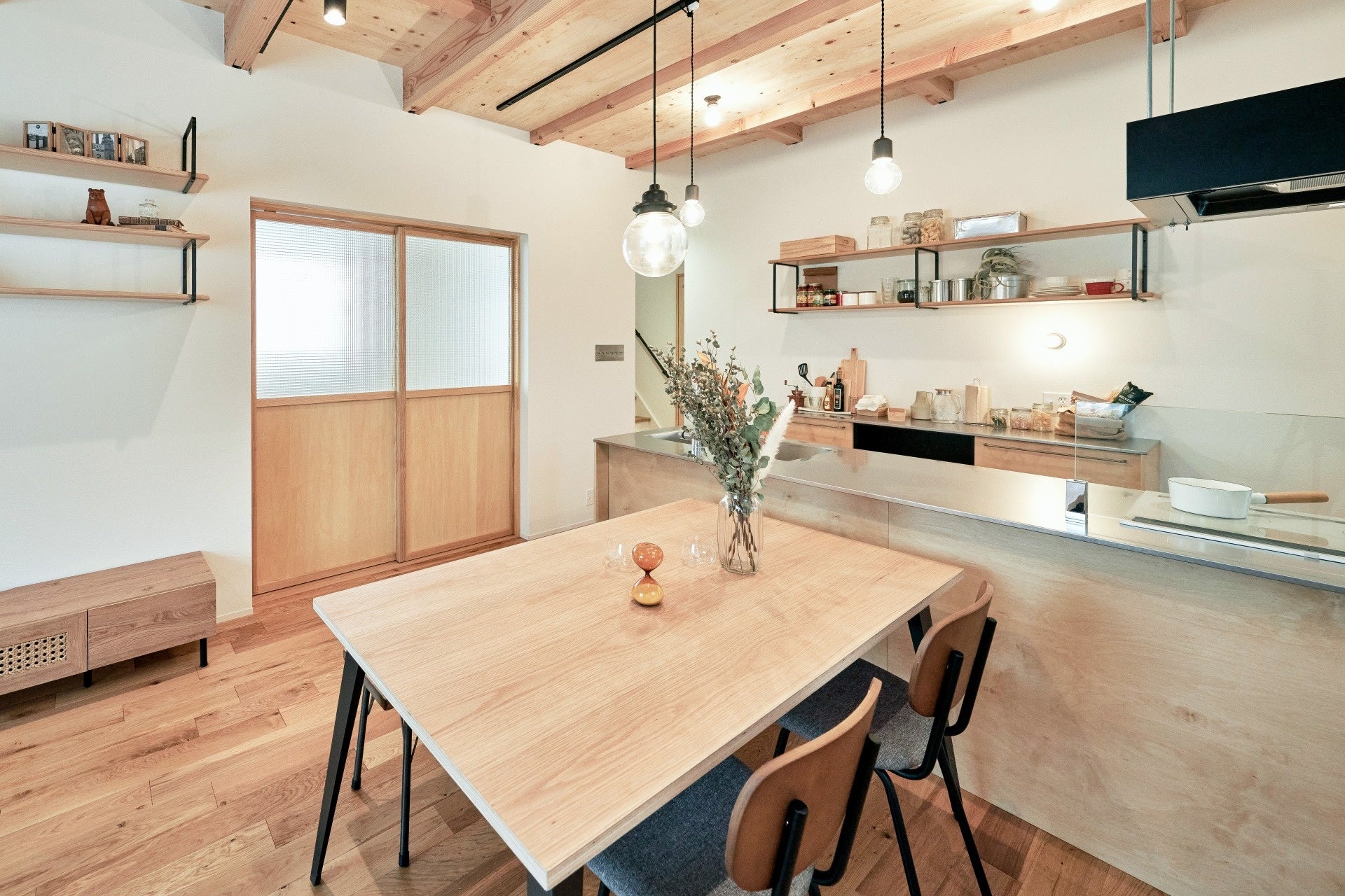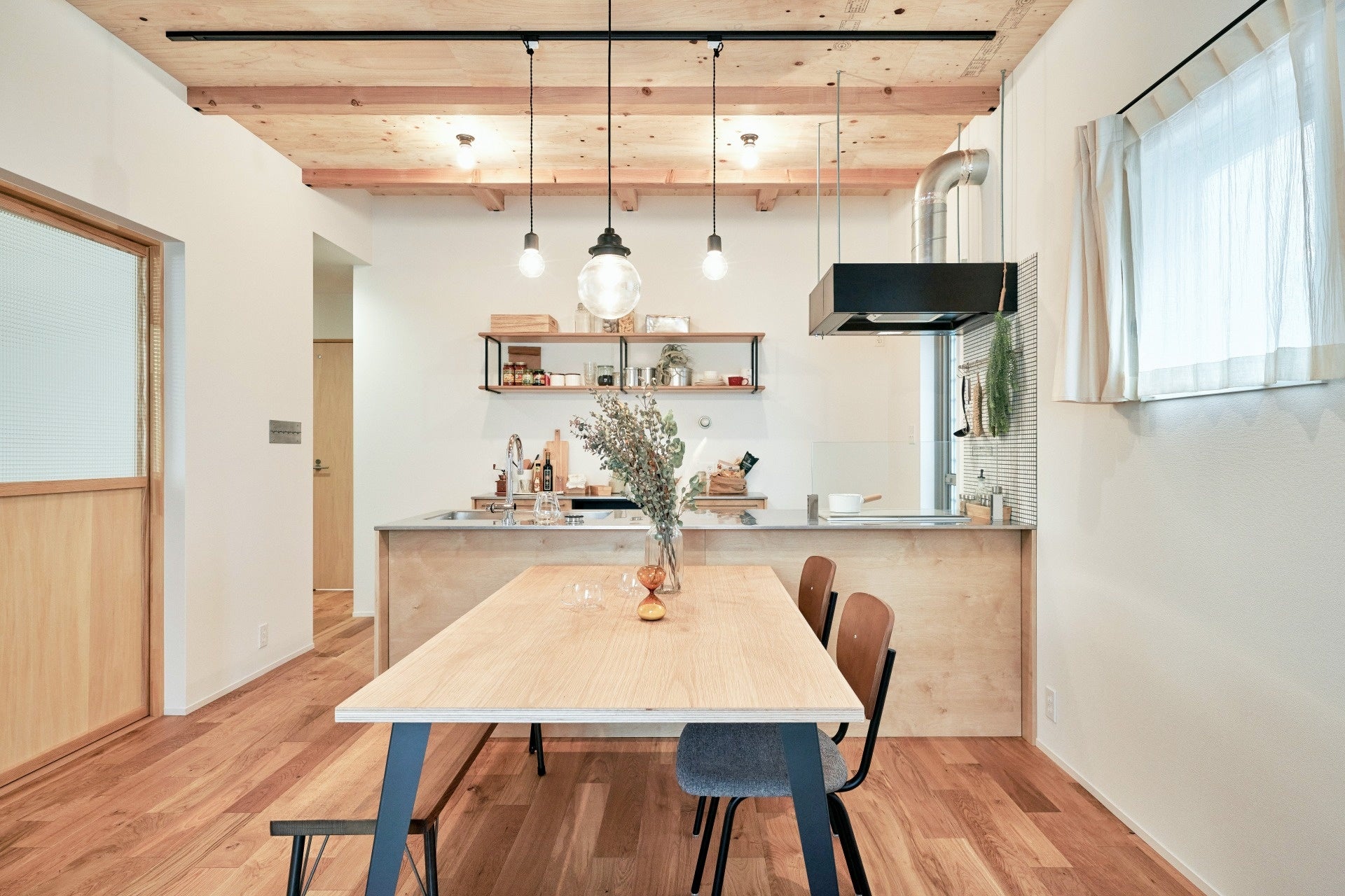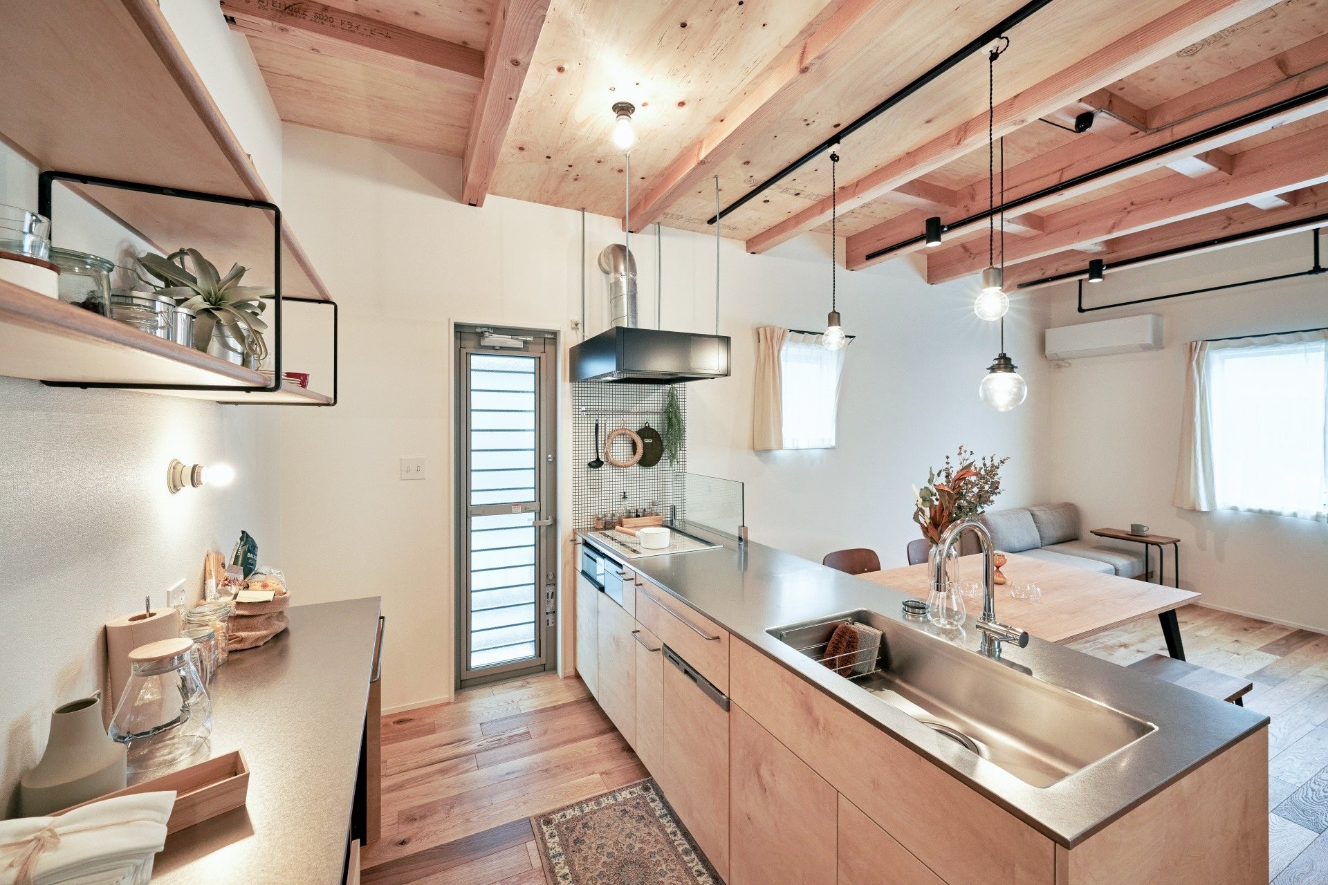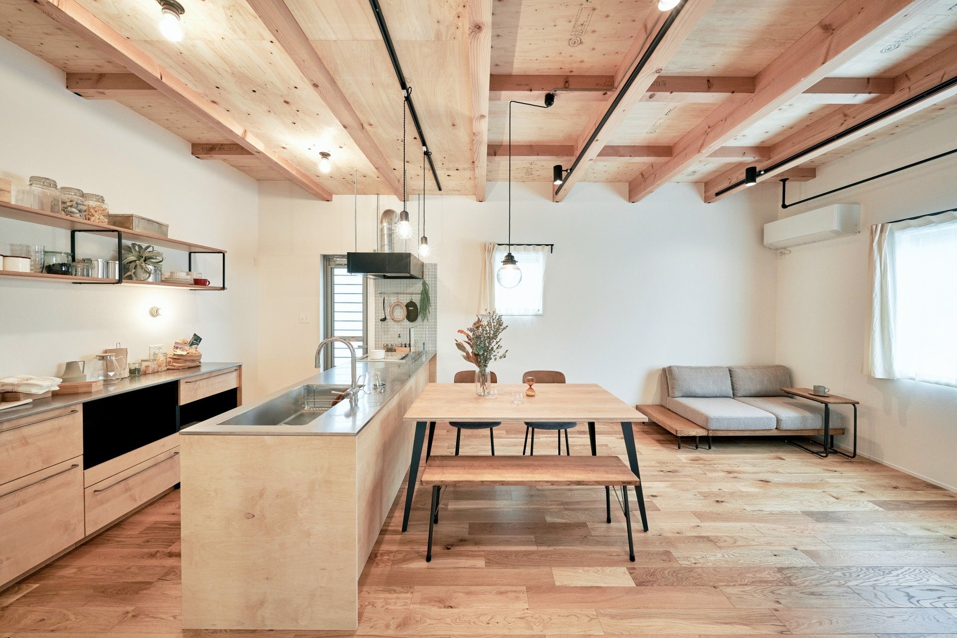 ▼家具のように空間へと馴染むtoolboxオリジナルの木製のシステムキッチン