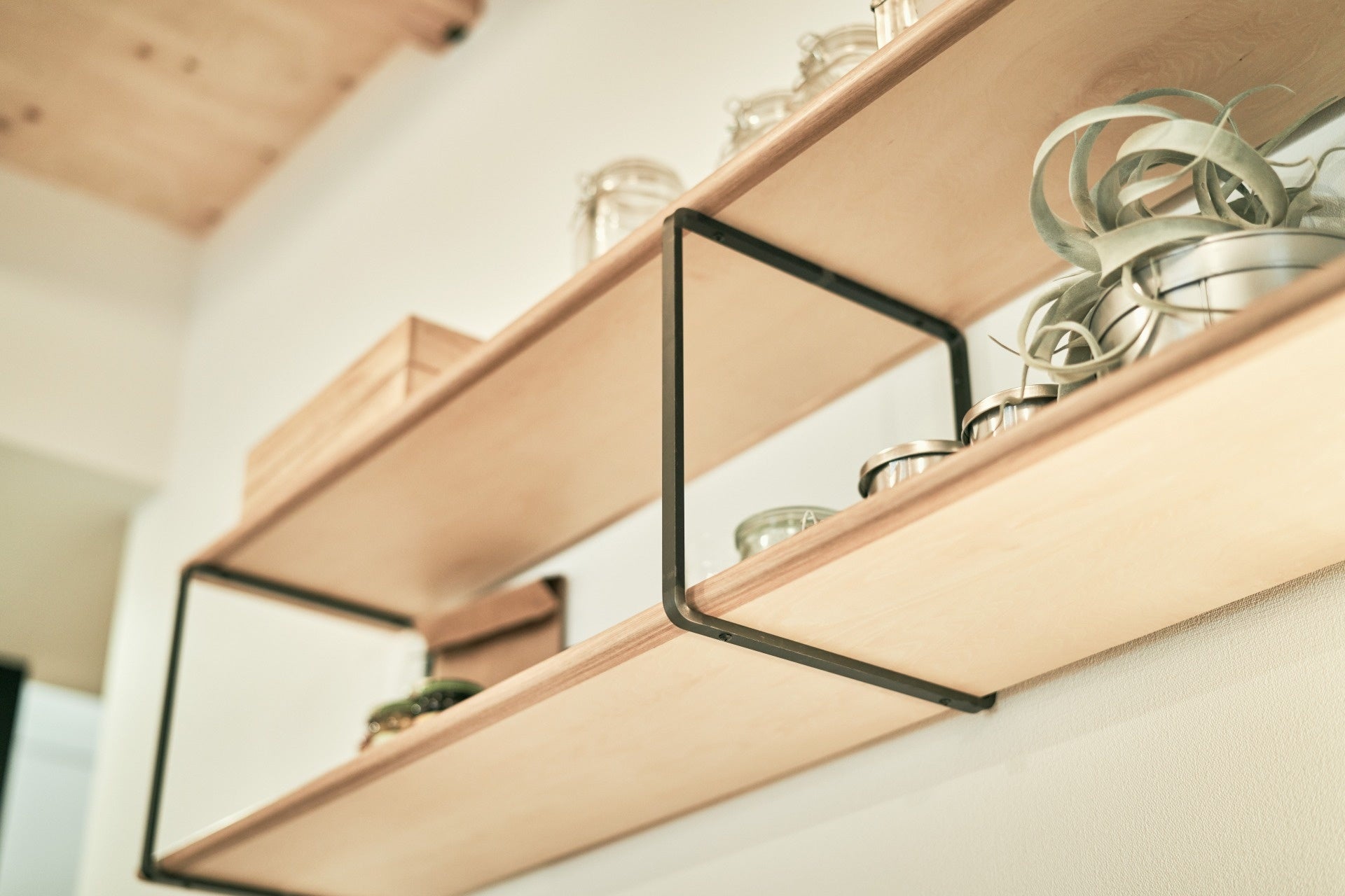 鉄をリング状に曲げた、角のカーブが美しい棚受けです。丁寧な職人の手作業による、マットな黒皮仕上げです。