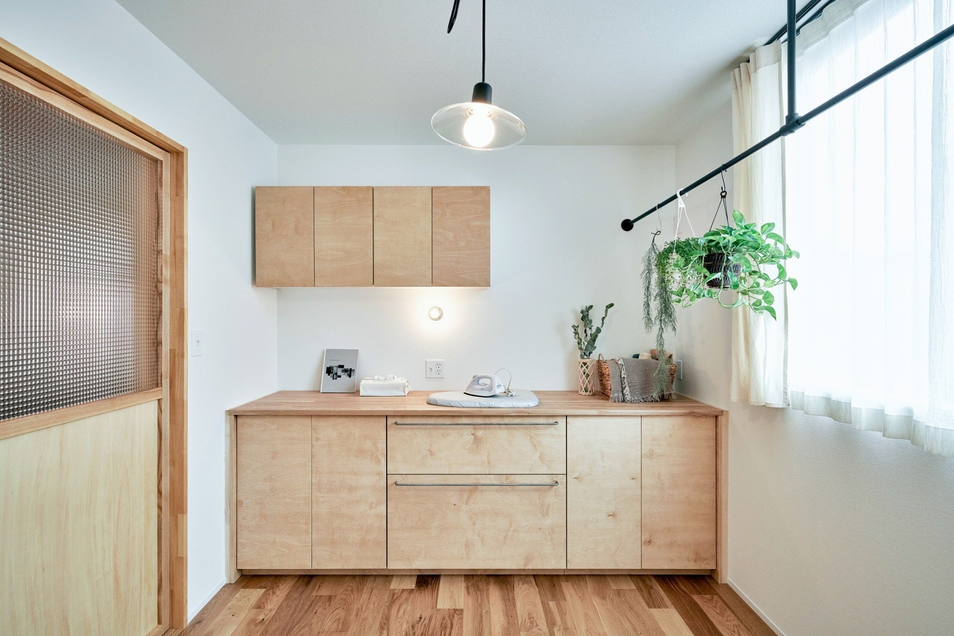 アイロン掛け等の家事や作業が出来るカウンターが付いた収納。家事室、趣味部屋や書斎に設置するのもお勧めです。