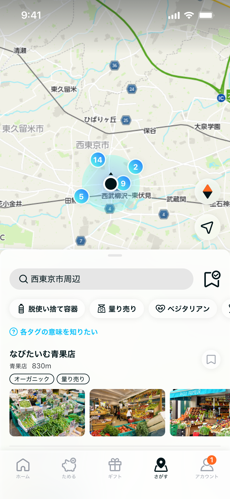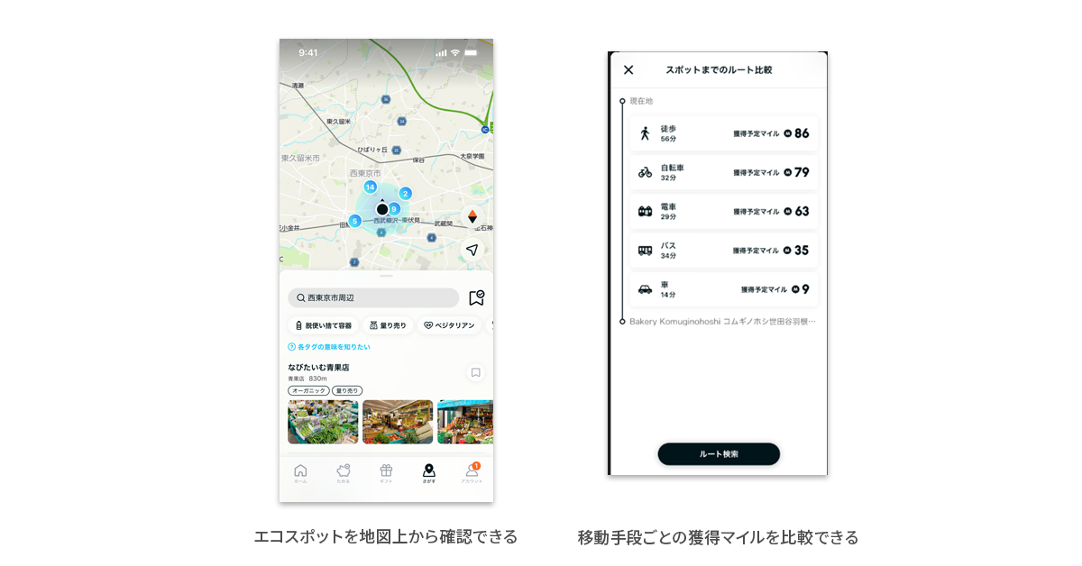 地図画面上で現在地周辺のエコスポットを検索することができます。「脱使い捨て容器」「量り売り」などのラベル(カテゴリ)から検索でき、エコスポットまでのルート検索は、より環境にやさしい(CO2排出量の少ない)移動手段を利用したルートを提案します。ルート結果には、移動手段ごとに付与されるマイルと移動時間が表示され、区間ごとの移動手段を変更することも可能です。エコスポットまでのナビゲーションは、『NAVITIME』など連携するアプリに遷移することでご利用になれます。
