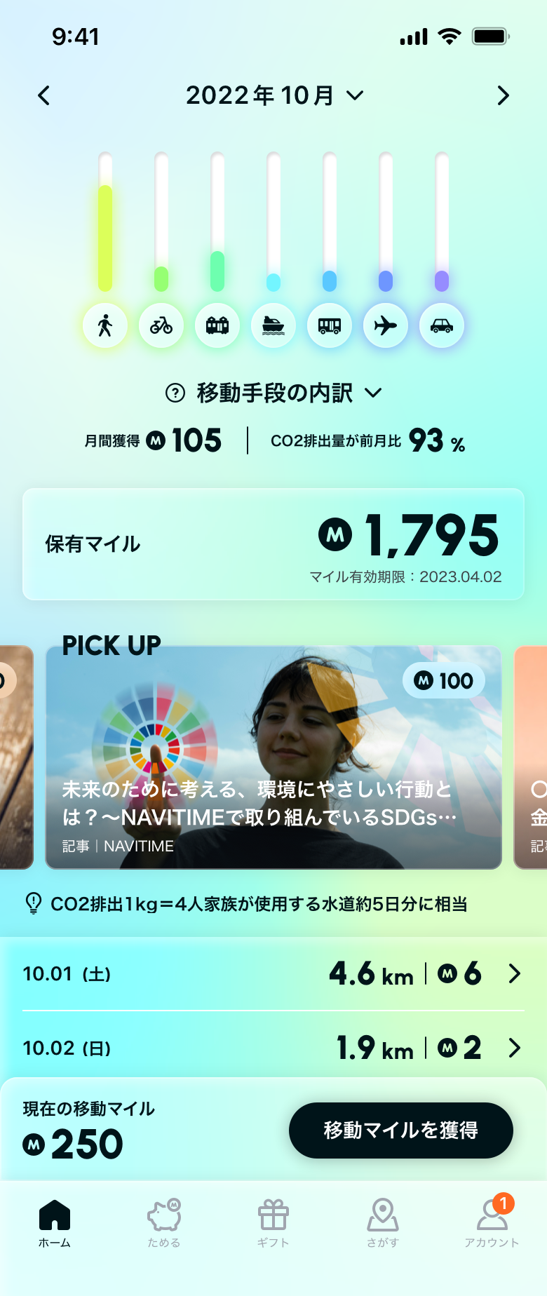 アプリの位置情報をオンにしてスマホを持って移動するだけで、移動情報に応じたマイルがたまり、移動情報を記録することができます。移動手段ごとに色分けして、1日の軌跡として地図上で確認できたり、月ごとの移動の中で、どの移動手段の割合が多かったかを、グラフによってひと目で確認できます。前月の移動に対してのCO2排出量の増減を、割合で確認することも可能です。移動情報は、徒歩・自転車・電車・フェリー・バス・飛行機・車の7種類から移動手段の推定を行い、ナビタイムジャパンの移動推定技術により、より正確な推定が可能です。