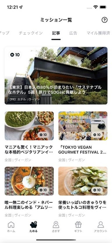 また、アプリ内に表示されるエコスポットにチェックインすることや、記事の閲覧などのミッションに参加し条件を達成することで、ミッションに応じたマイルを受け取ることができます。
