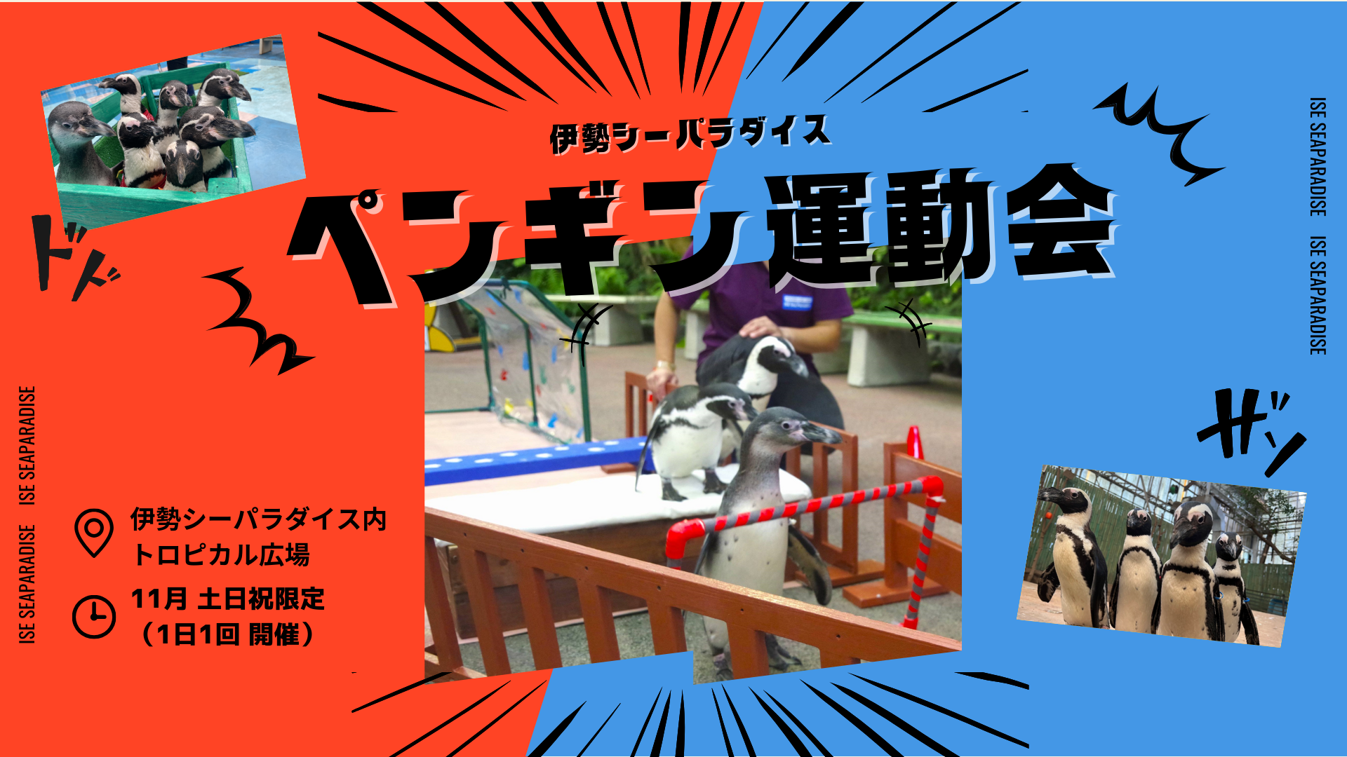 三重県伊勢市にある「伊勢シーパラダイス」では、2023年11月の土・日・祝限定で『ペンギン運動会』を開催いたします。「ペンギンの森」で暮らしているペンギンたちが外へ飛び出し、障害物を潜り抜けてゴールを目指すレースに参加します。自由気ままなペンギンたちのゆる~い運動会にぜひご参加ください。