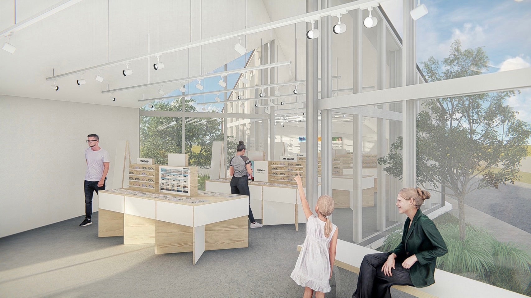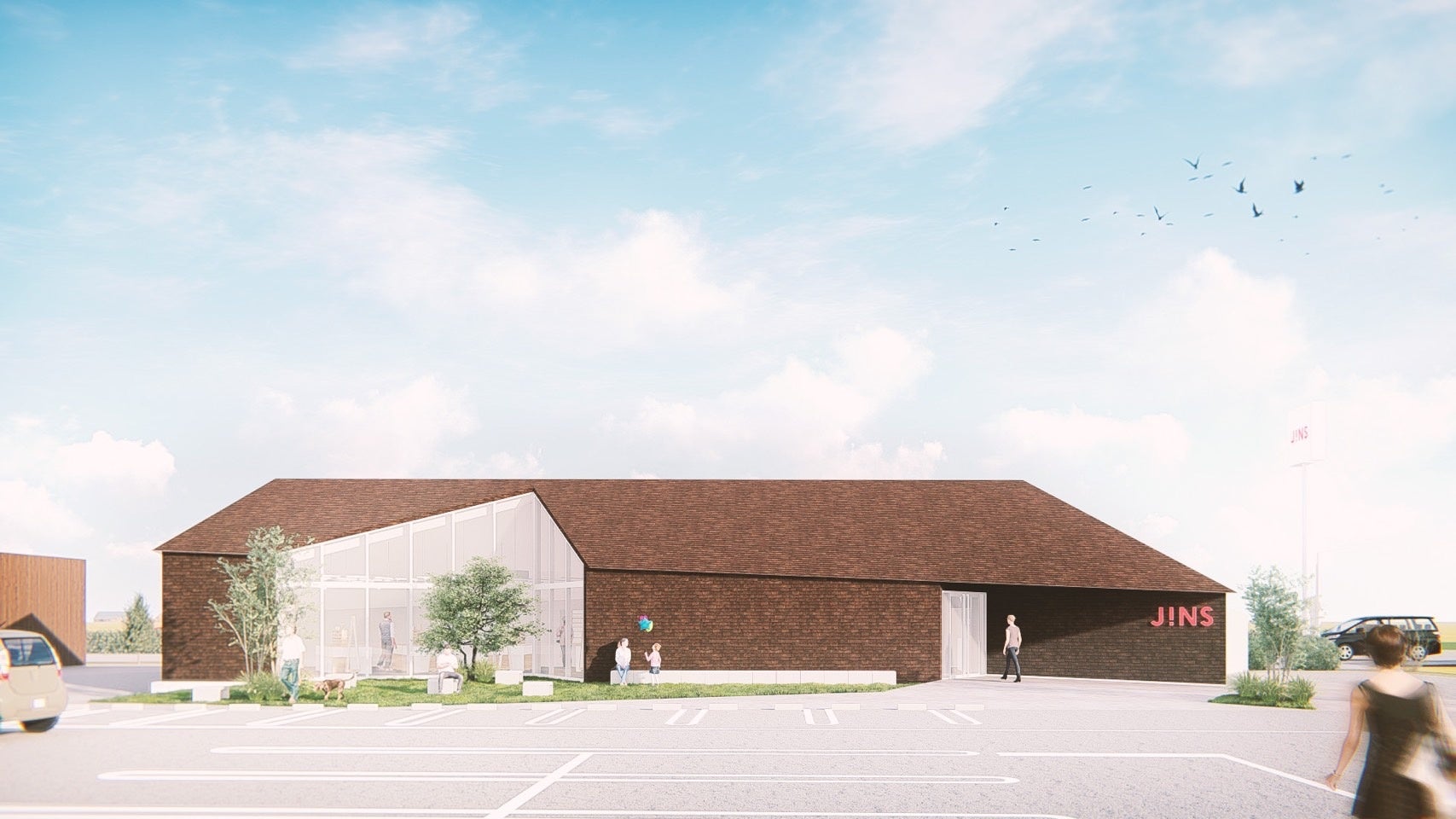 設計は、rim of jins札幌ステラプレイス店や今年の5月に移転・稼働を開始したJINS東京本社を手掛けた、新進気鋭の建築家・髙濱史子氏が担当。高濱氏がJINSのロードサイド店舗を手掛けるのは初めてとなります。