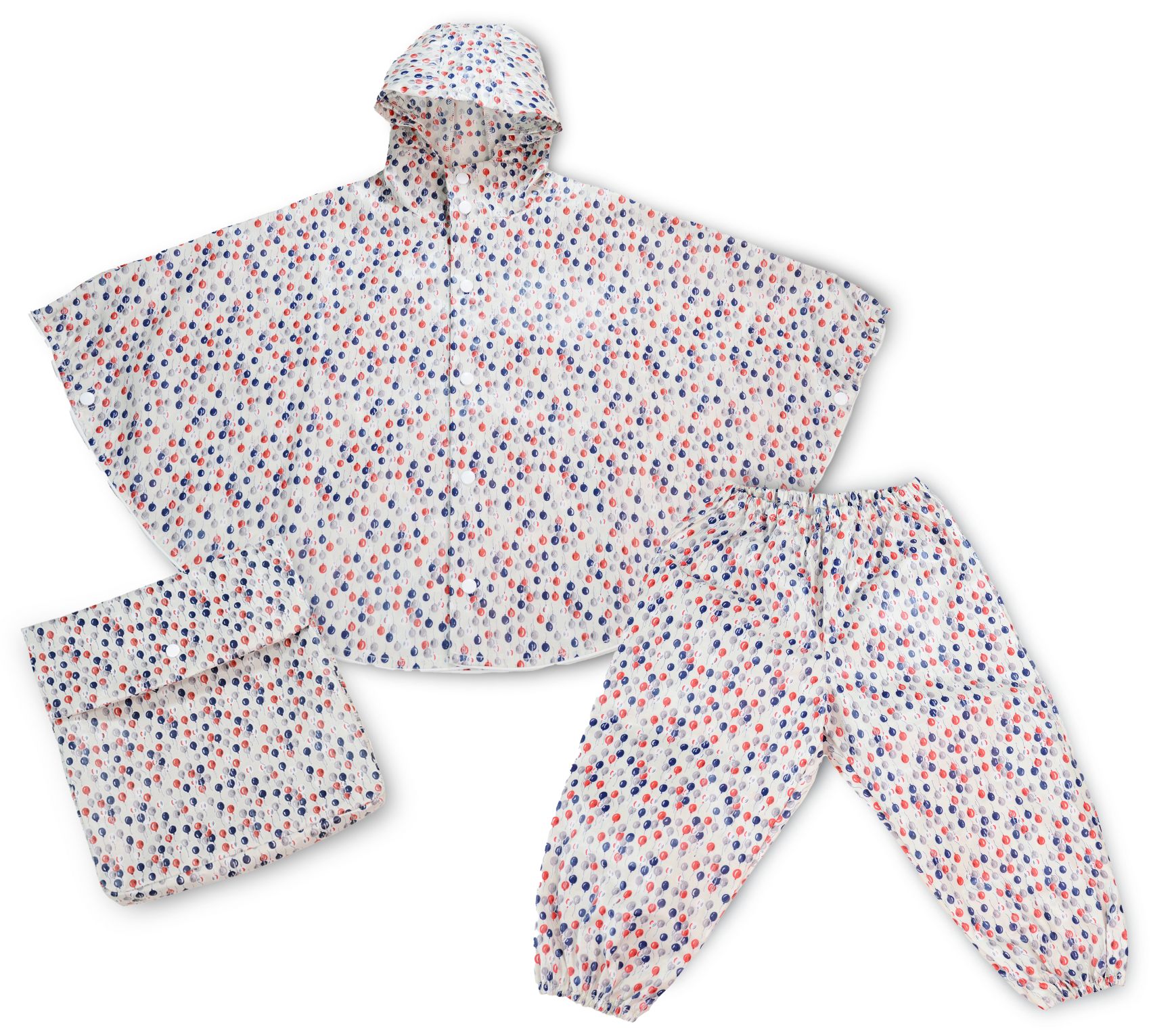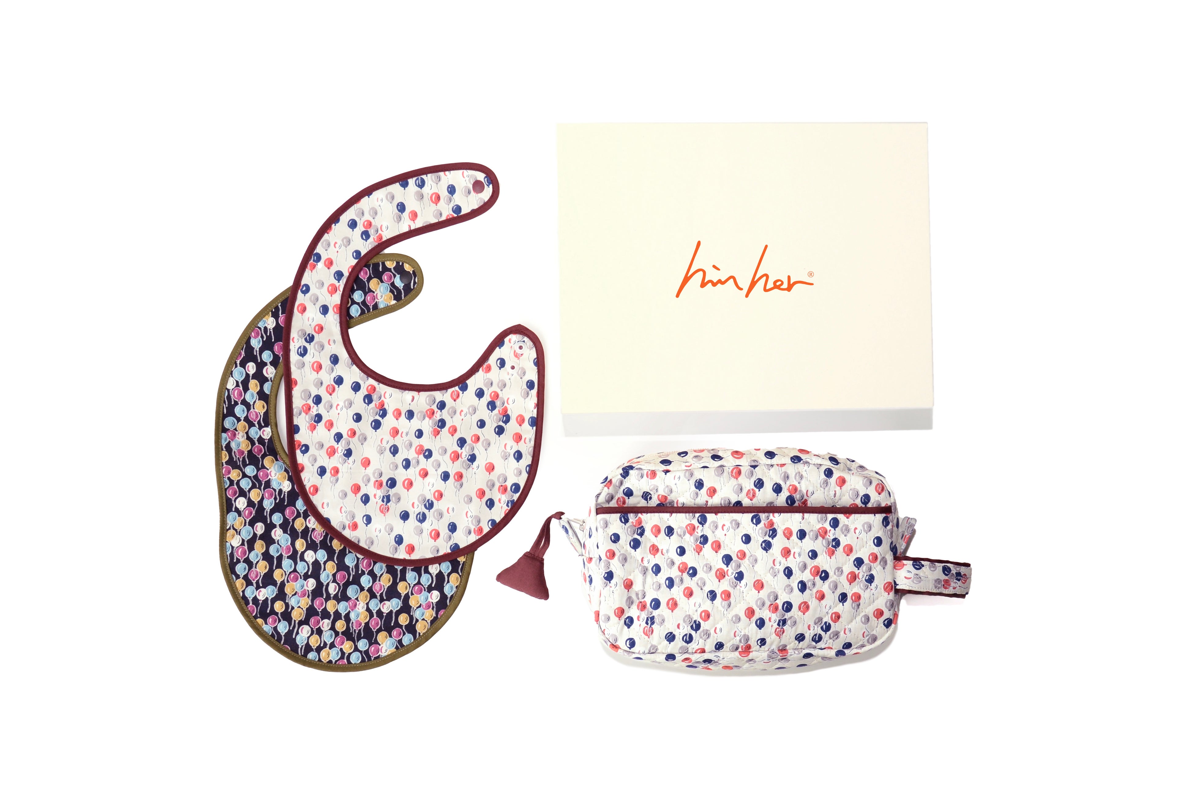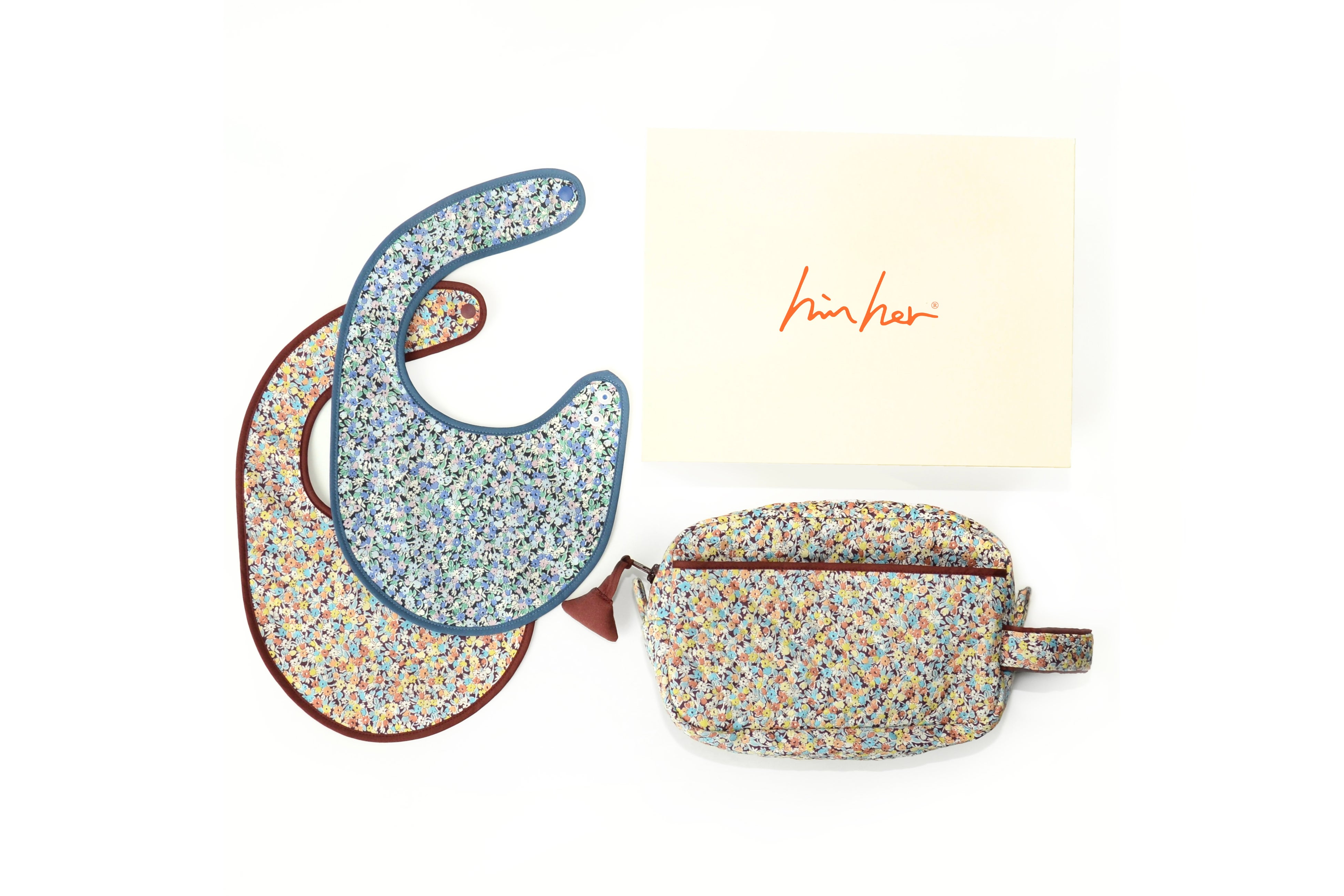 浅見 れいな氏は、防水加工が施されたフード付きポンチョとパンツのセットとそれらを収納できるバッグを制作、野波 麻帆 夫妻の展開する himher は、新生児向けのギフトとしても重宝しそうな、スタイとオムツ入れにぴったりのポーチのセットを、それぞれ2種類のプリントで制作しました。