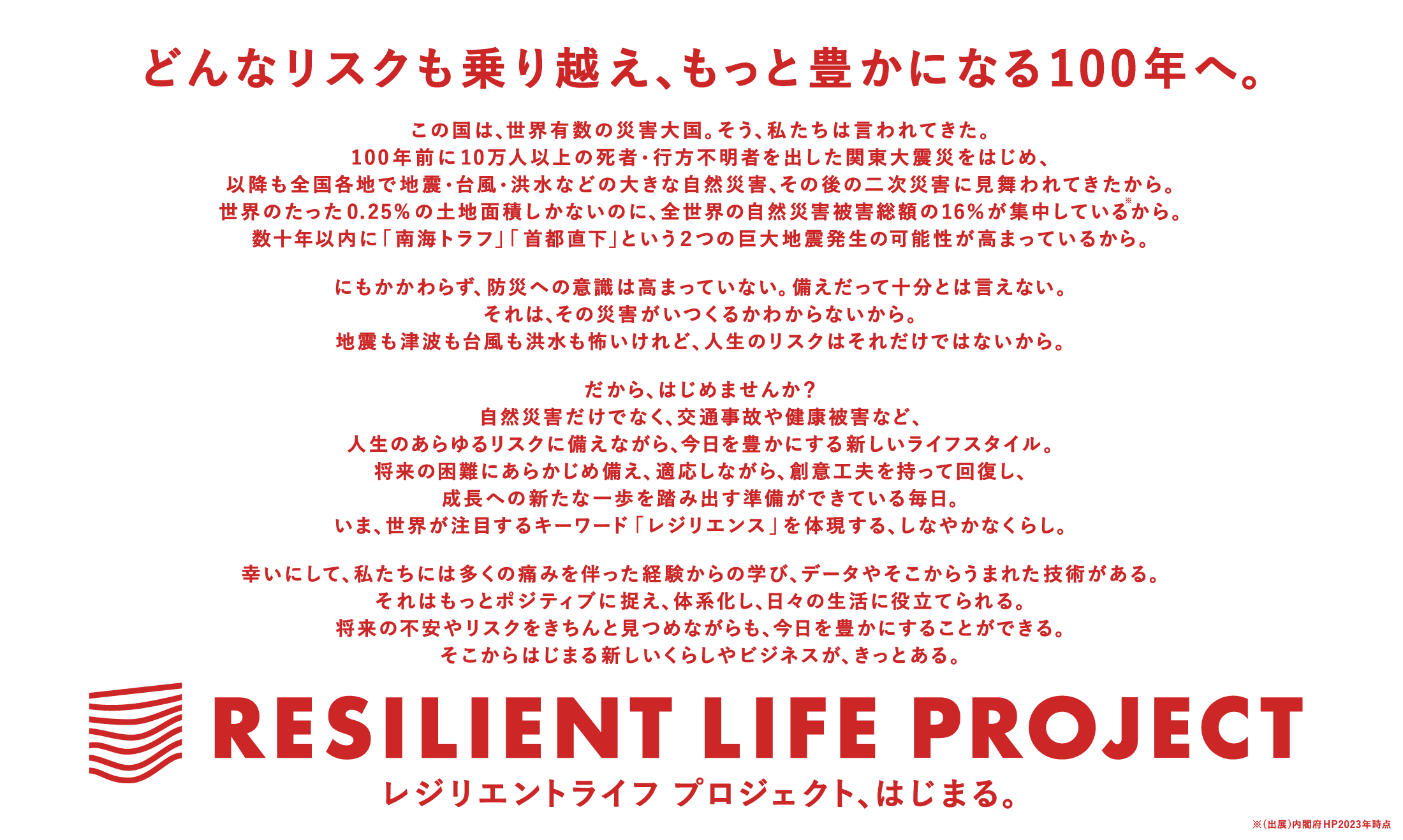 本プロジェクトは、自然災害をはじめ、社会、そして個人に起因するリスクまで、あらゆるリスクが生み出す困難を乗り越えるためのレジリエンス(適応力、回復力、教訓を得て成長・予防のサイクルに繋げる力)を高め、より豊かな生活の実現を目指す取り組みです。