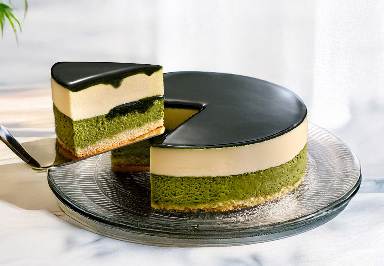 抹茶ベイクドチーズとレアチーズの2層のケーキに酸味のある抹茶ジュレを表面と中層に加えました。