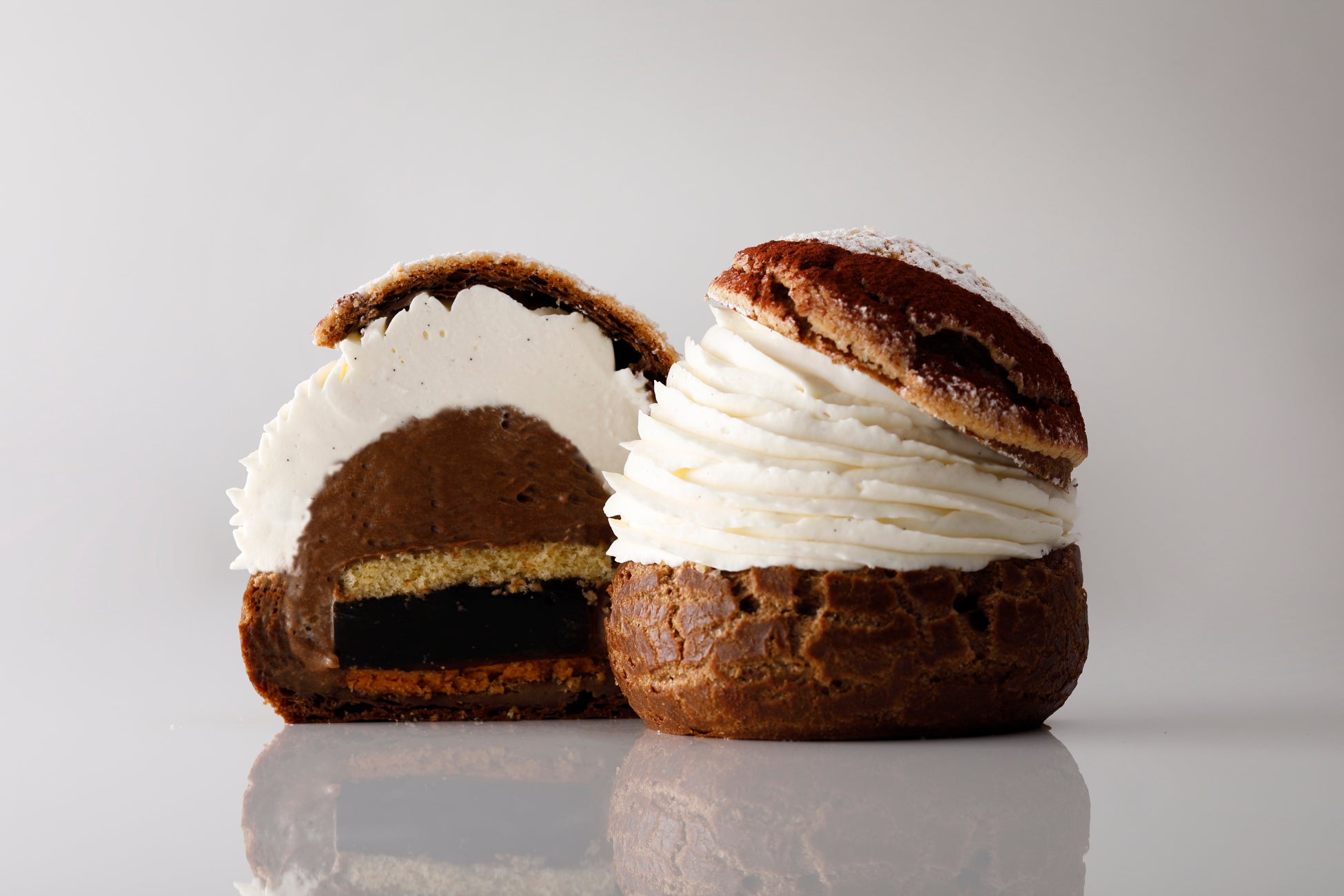 ビュッフェのはじまりを彩るのは、新作『ティラミスシュークリーム』。香ばしいクッキーシューに、ほろ苦いコーヒージュレとカスタード、たっぷりのマスカルポーネクリームを重ねました。