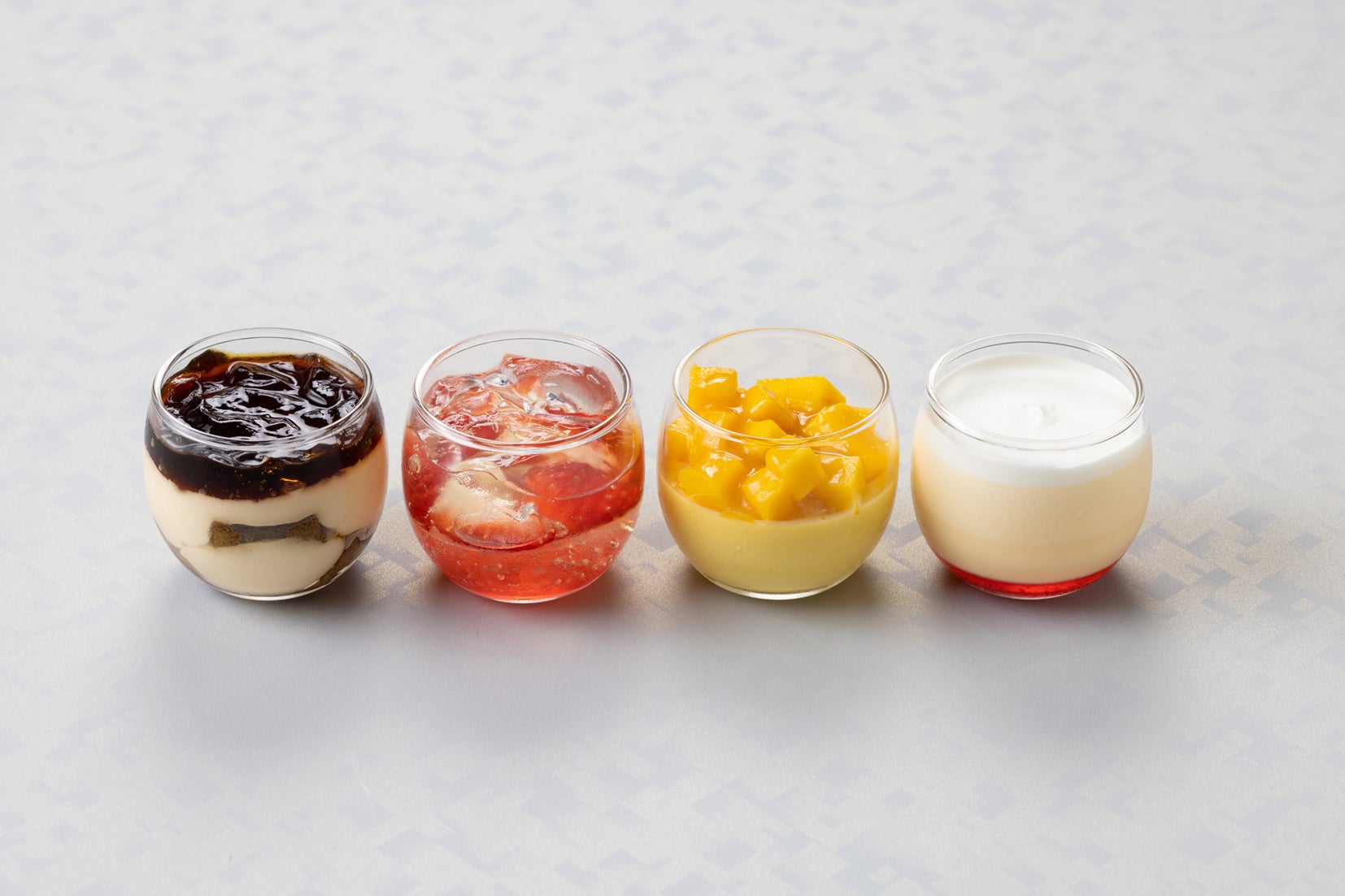 手土産としてもご好評をいただいているグラススイーツ“ベリーヌ”4種類を小さいサイズでセットにしました。苺とイタリアのスパークリングワイン“スプマンテ”のゼリーやベリーのキャラメルがアクセントになったクリームキャラメル、濃厚なマンゴーの味わいが楽しめるマンゴープリン、少し大人の味わいのティラミスを少しずつお楽しみいただけます。見た目にも華やかなグラススイーツセットは、お正月の集まりなどへの手土産としてもおすすめです。