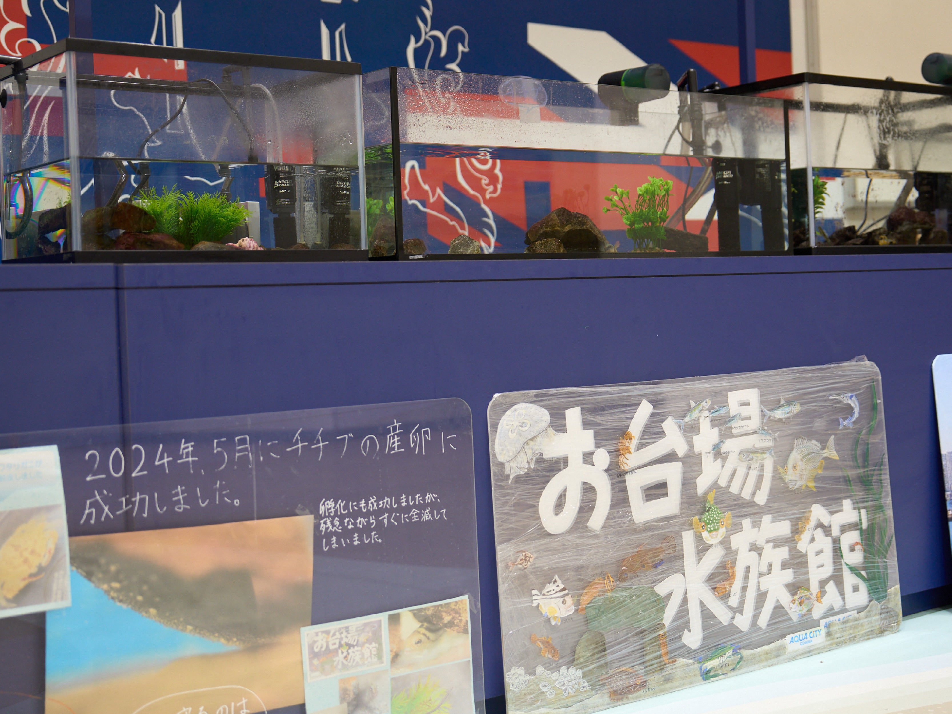 1Fのエントランスには、お台場の海の魚を展示した子ども達がつくった「お台場水族館」があります。来校者などどなたでも鑑賞可能になっています。