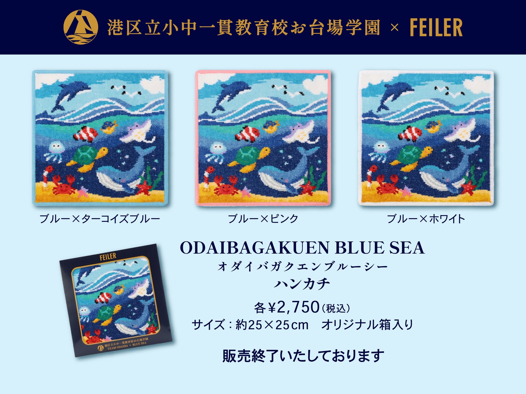 “ブルーシー”プロジェクトのハンカチは、2025年11月にフェイラーの旗艦店であるフェイラー銀座本店およびフェイラー公式オンラインショップ( https://feiler.jp/ )にて発売し、多くのお客様から大変好評をいただき、発売後まもなく完売いたしました。発売にあたり、フェイラー銀座本店では、港区立小中一貫教育校お台場学園の子供たちが自らの手で商品を販売する販売体験を行いました。そして、2026年1月には、本コラボレーション商品の売上の一部を、特定非営利活動法人 海の環境教育NPO bridgeに寄付いたしましたことをご報告いたします。寄付金は、日本中の子供たちが海の環境を学ぶ教材制作に役立てられ、「海の環境を守る大切さ」を発信したい、という子供たちの想いをカタチにすることができました。商品をお買い上げいただきました皆様のご協力に感謝いたします。ありがとうございました。