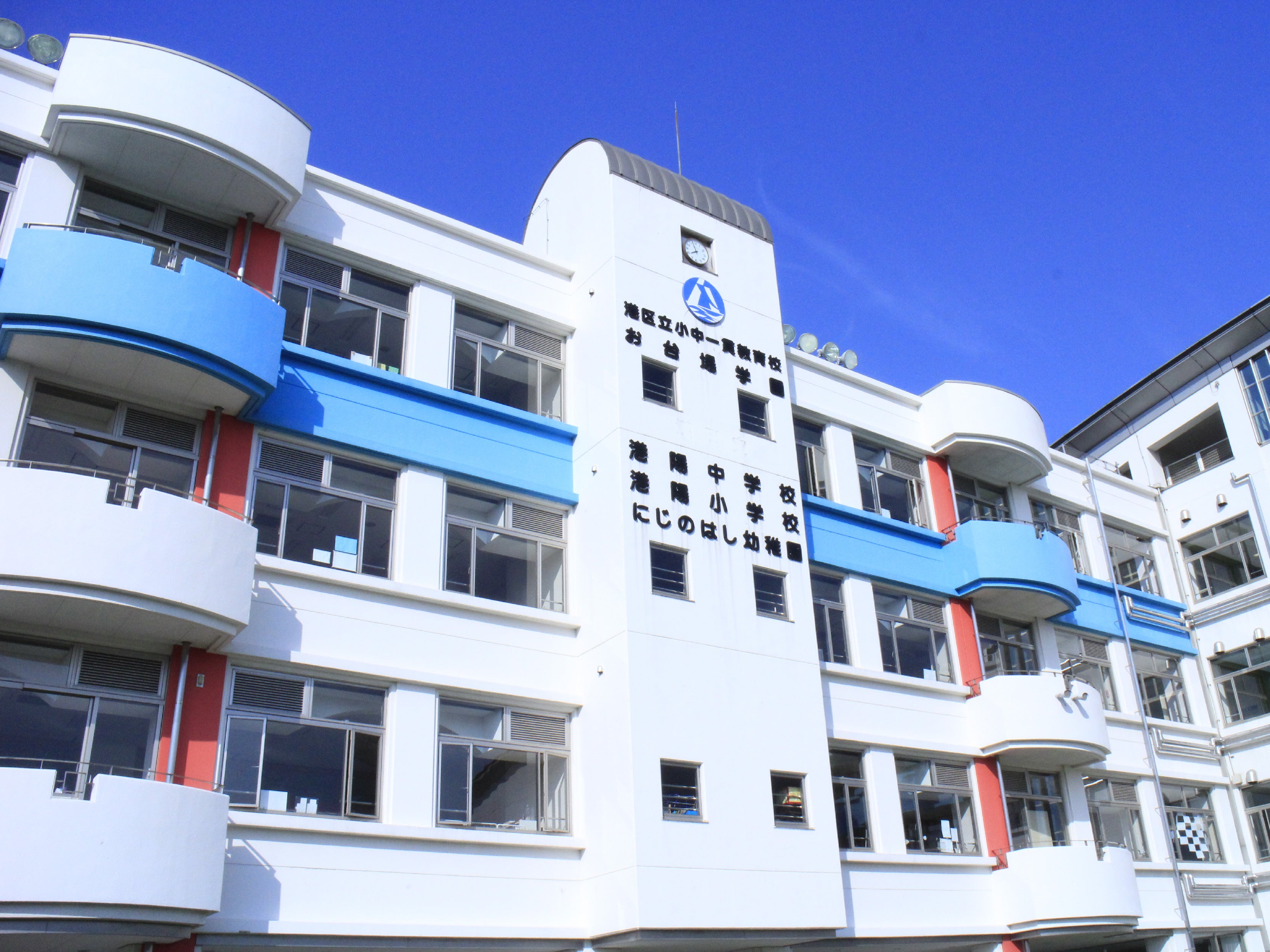 平成8年4月、東京臨海副都心としてのお台場開発に伴い、港陽小学校、港陽中学校、にじのはし幼稚園が同一敷地内に開校、開園しました。平成22年には港区立小中一貫教育校「お台場学園」と、名称を変え現在に至っています。今年の10月には開校30周年を迎えます。