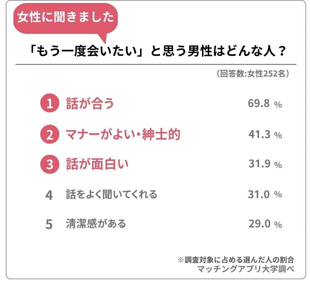 では、逆に「もう一度会いたい」と思われる女性にはどのような特徴があるのでしょうか。性格や行動などについて聞いてみました。