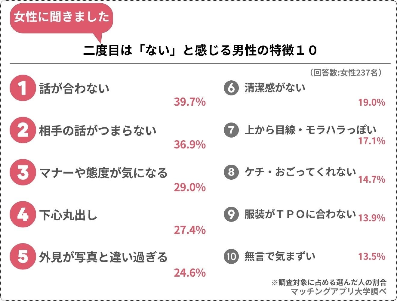 今回の調査では、マッチングアプリで初めて会った異性に対して「二度目はない」と感じる特徴について調査をしました。