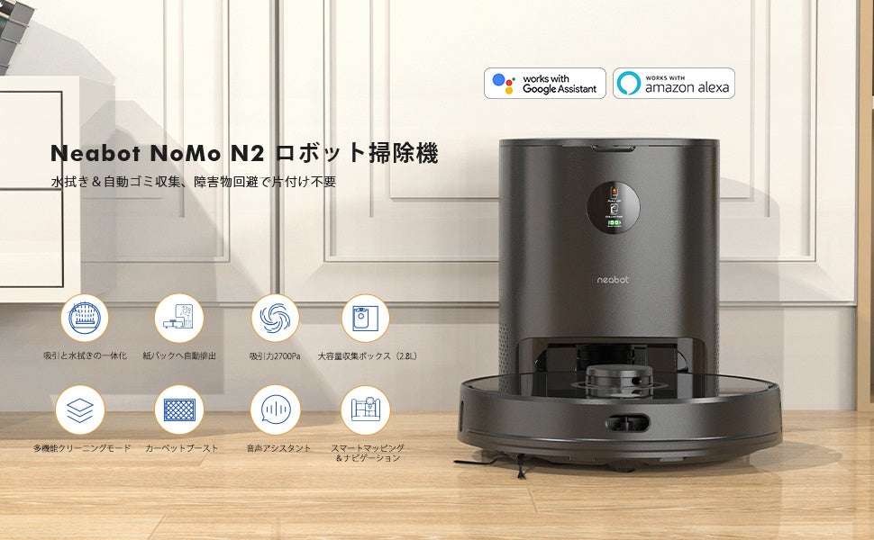 - Neabot NoMo N2 ニーボット ロボット掃除機【水拭き&ゴミ収集全自動】 自動充電/ゴミ排出 スマートマッピング トラブル回避/衝突・落下防止 2700Pa App対応 掃除時間/範囲/回数を設定【ブラック】