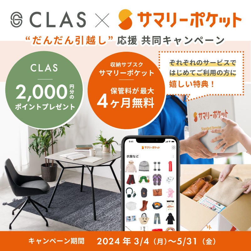 認知度No.1(※1)の家具と家電のレンタル・サブスク「CLAS(クラス)」(https://clas.style/)を運営する、持たない、捨てない社会をつくる株式会社クラス(本社:東京都目黒区、代表取締役社長:久保 裕丈)は、宅配収納サービス「サマリーポケット」と2024年3月4日(月)〜5月31日(金)まで、両社のサービスを利用することでお得に引越しや新生活ができるキャンペーンを共同で開催します。