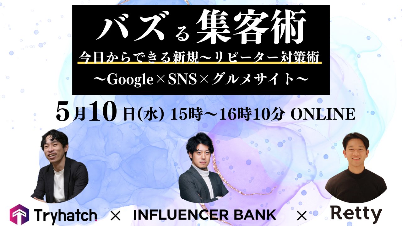 【5月10日15:00〜】トライハッチ×INFLUENCER BANK×Retty共催セミナー「バズる集客術!今日からできる新規~リピーター対策術」を開催