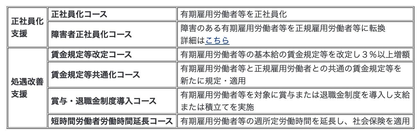 6つのコースがあり、大きく「正社員化」と「処遇改善」の取り組みに分けられます。