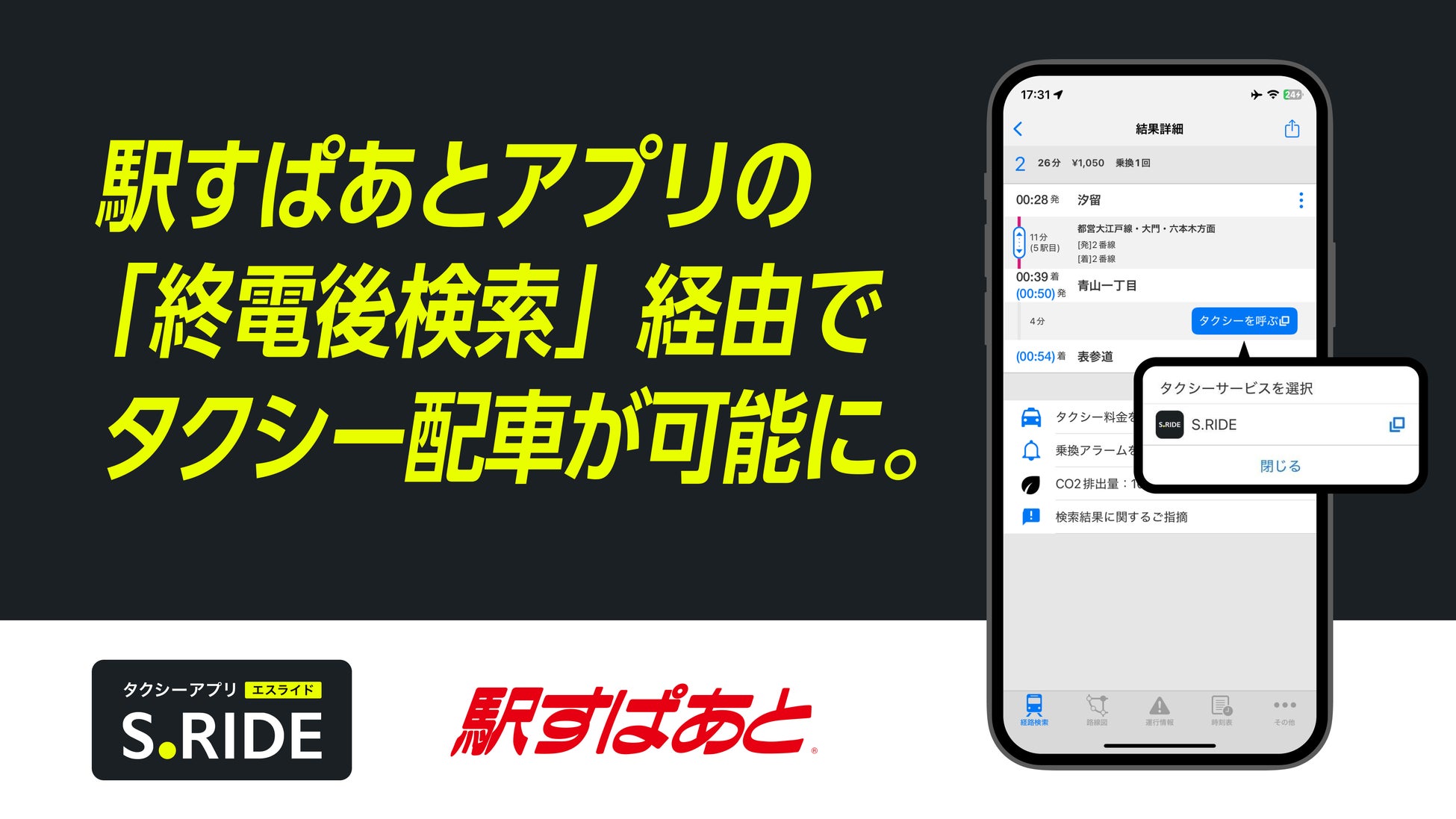 S.RIDE株式会社(本社:東京都港区、代表取締役:橋本洋平、以下S.RIDE)は、株式会社ヴァル研究所(本社:東京都杉並区、代表取締役:菊池 宗史)と連携し、全国のJRや私鉄などの鉄道路線を中心とした公共交通機関の最適経路及び運賃情報を提供する「駅すぱあとアプリ(iOS版)」と、タクシーアプリ 「S.RIDE(エスライド)」のアプリ連携を2025年4月2日(水)より開始します。