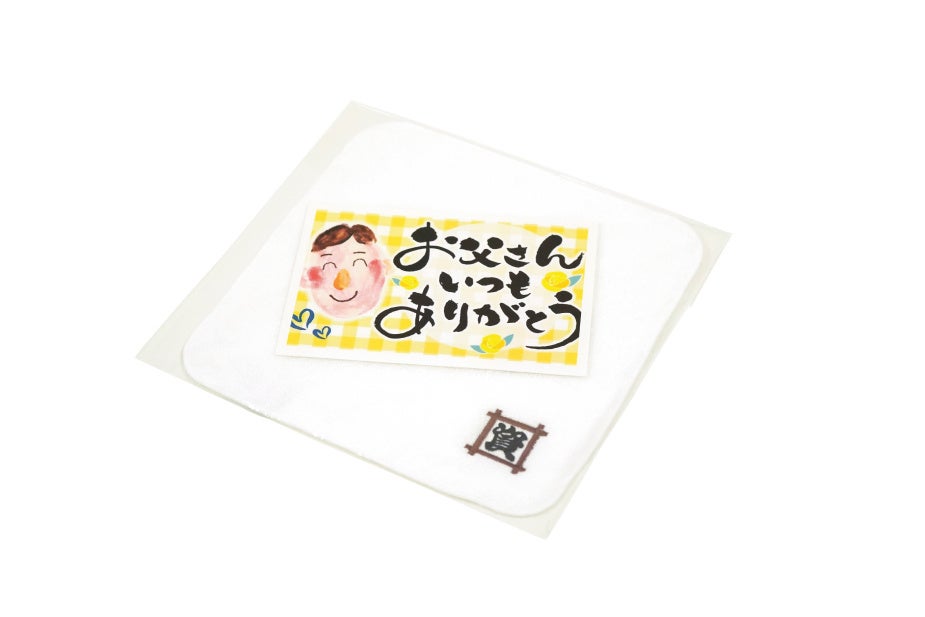 お送りするギフトと一緒に「お父さん いつも ありがとう」のメッセージが入ったカードと「資」の刺繍ロゴをあしらった特製今治タオルハンカチもご用意しました!