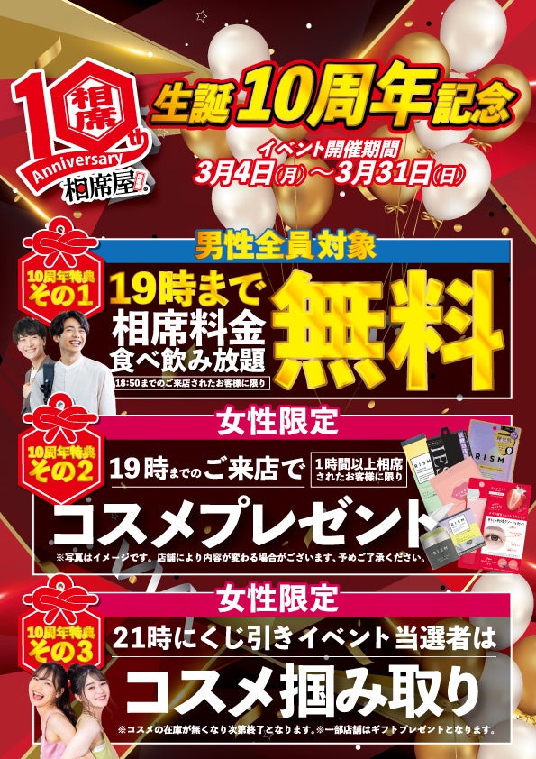 また10周年を迎え、さらにZ世代含む多くの方に相席屋を知っていただきたくZ世代若者応援キャンペーンも同時に開催いたします。
