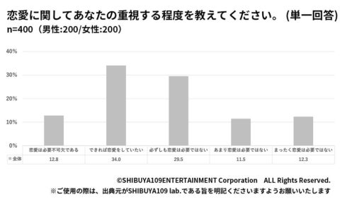 実際にSHIBUYA109 lab.で実施した「恋愛や結婚観に関する調査」(15~24歳男女 n=400)では、「恋愛は人生に必要不可欠」と考えているのは12.8%にとどまる結果となりました。