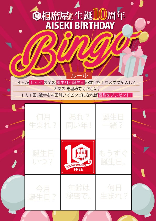相席屋は2014年3月に赤羽に1号店をオープンしてから今年で10周年を迎えます。これもひとえにご愛顧いただいているお客様のおかげと存じ、感謝申し上げます。