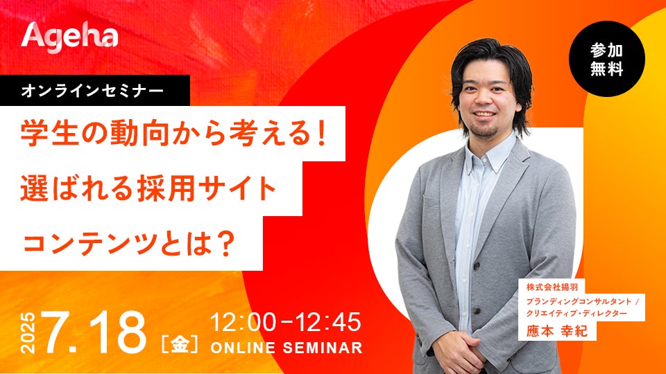 コーポレートブランディング支援を行う株式会社揚羽(東京都中央区 代表取締役社長:湊 剛宏 証券コード:9330)は、2025年7月18日(金)に「学生の動向から考える!選ばれる採用サイトコンテンツとは?」と題したオンラインセミナーを開催します。セミナー詳細はコチラ。